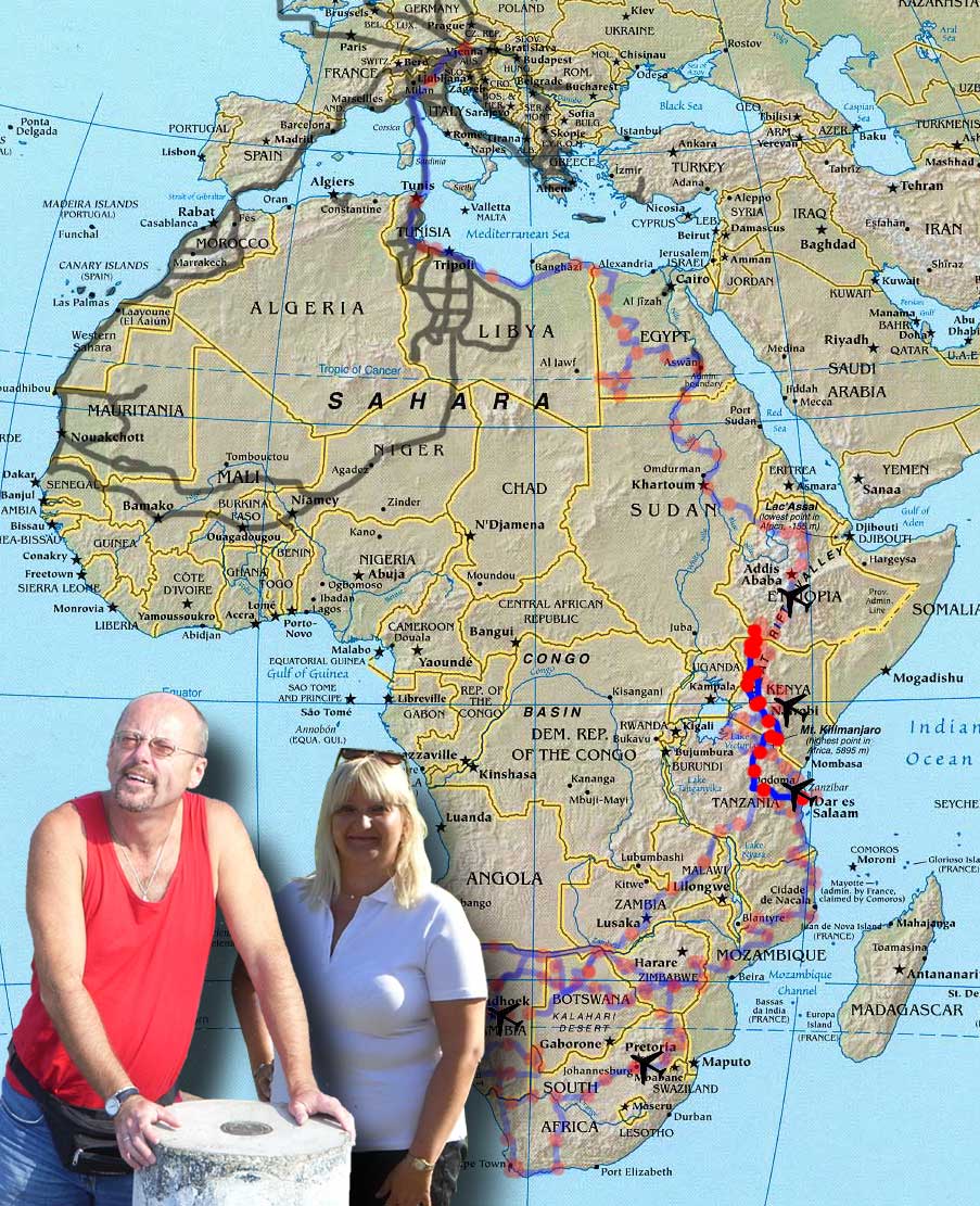 Meine 26. Afrikareise verläuft unplanmäßig. Sie sollte von Daressalam, wo unser Toyota wartet, durch den Norden Tansanias führen, vorbei am Kilimandjaro nach Nairobi, durch die Wüstengebiete Nord-Kenias, westlich vorbei am Turkana-See nach Äthiopien und durch das westliche Omo-Valley nach Addis Abeba. Durch das nord-äthiopische Hochland wollen wir in den Nord-Sudan fahren, wo wir unser Buschtaxi in Khartoum nocheinmal für ein paar Monate abstellen wollen. Unvorhergesehene Ereignisse lassen uns jedoch Addis Abeba nicht erreichen und wir müssen nach Kenia umkehren.