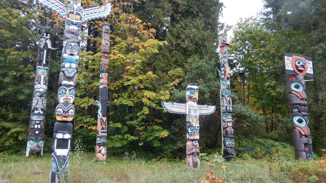 Nach einem Spaziergang zu den Shannon Falls fahren wir auf den Cypress Mountain, von wo man einen schönen Blick auf das jenseits des Burrand Inlet gelegene Vancouver hat. Die über das Inlet führende Lion's Gate Bridge erinnert stark an die Golden Gate Bridge und führt zum auf einer Halbinsel gelegenen Stanley Park, der vier Quadratkilometer großen grünen Lunge Vancouvers. Unser erstes Ziel ist aber die English Bay, deren Strand mit Palmen überrascht. Hier steht auch eine Gruppe von zehn oder 15 überlebensgroßen Statuen lachender Männer. Die bringen einen ebenfalls zum Lachen, das lässt sich gar nicht vermeiden. Wir machen nun einen Spaziergang um den Canada Place, die Anlegestelle für Kreuzfahrtschiffe, die mit ihren nachempfundenen Segeln an die Oper in Sydney erinnert. Der Hafen von Vancouver ist insofern ungewöhnlich, als hier auch unzählige Wasserflugzeuge starten und landen. Für einen Blick auf die Skyline Vancouvers fahren wir mit einer öffentlichen Fähre auf die andere Seite des Burrand Inlets und mit dem gleichen Boot wieder zurück. In der Nähe des Canada Place befindet sich die Steamclock, eine dampfbetriebene Uhr, die stündlich ein Liedchen pfeift. Wir fahren noch durch die Mainstreet und Chinatown und machen zum Abschluss des Tages einen ausgedehnten Spaziergang im Stanley Park. Km 158/10.512/123.117.