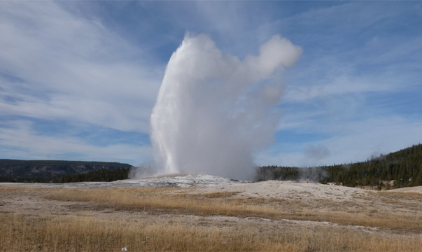 Der Yellowstone Nationalpark ist nicht umsonst einer der bekanntesten und meistbesuchten Nationalparks der Welt. Er liegt auf über 2.000 Metern Seehöhe. Überall raucht1 und pfaucht, pfufferlt2, brodelt, köchelt und blubbert es. Wir durchfahren den Nationalpark von Nord nach Süd und halten an den sehenswertesten Stellen, etwa am Norris Geyser Bassin. Vor dem Steamboat Geyser haben es sich ein paar Geysir-Fanatiker auf Campingstühlen bequem gemacht, die Kameras auf den Stativen. Manche sitzen schon tagelang da und warten auf die nächste Eruption. An einer Tafel ist die letzte mit 7. Oktober vermerkt. So viel Geduld haben wir nicht, aber die Dampfsäule ist auch ohne Fontäne ganz ansehnlich. Am Old Faithful Geyser haben wir mehr Glück. Hier warten schon hunderte Menschen auf den nächsten Ausbruch und kaum sind wir da, schießt der Geysir etwa eine Minute lang haushohe Fontänen in die Luft. Im Süden grenzt der Yellowstone direkt an den Grand Teton Nationalpark. Die Straße verläuft auf einem Hochplateau entlang der schneebedeckten Kette der Teton Mountains. Am Oxbow Bend spiegeln sich die Berge im Snake River, Wasservögel und Otter tummeln sich. Km 224/13.832/126.436.