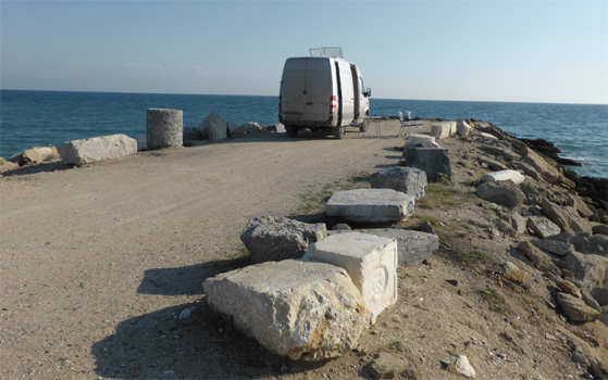 Noch vor Sonnenaufgang hat es 24 Grad. Herrlich: Frühstück im Freien. Am Vormittag machen wir einen Abstecher nach Harran, einem Dorf nahe an der syrischen Grenze, schon in der fruchtbaren mesopotamischen Tiefebene. Wo Milch und Honig fließen. Auf vielen Feldern wird gerade Baumwolle geerntet. In Harran gibt es neben den Ruinen einer antiken Stadt, an der noch immer Grabungsarbeiten im Gange sind, noch Trullihäuser zu sehen, von denen viele heute noch bewohnt sind. Dabei handelt es sich um Lehmhäuser, die an die Form von Bienenstöcken erinnern. Auf der Autobahn geht es von Sanliurfa über Gaziantep bis kurz vor Adana. Am Euphrat passieren wir zwei Flüchtlingslager direkt links und rechts der Autobahn und direkt am Fluss. Wir biegen nach Yumurtalik ab und machen an der nordöstlichen Ecke des Mittelmeeres Rast. Wir übernachten direkt am Meer, das übrigens so warm ist, dass es kaum eine Abkühlung bietet. Km 465/7.002.