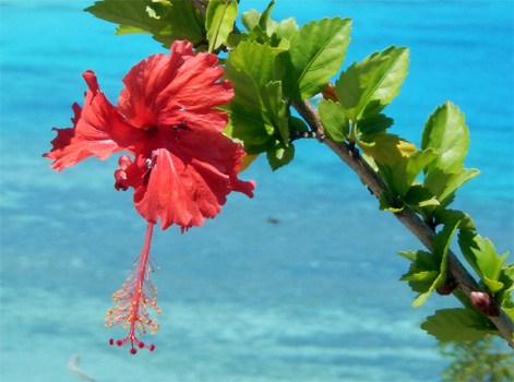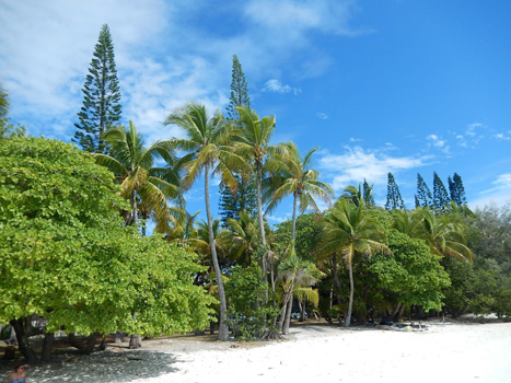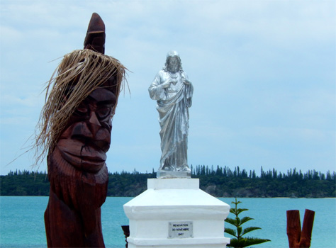 James Cook nannte die etwa 15 mal 15 Kilometer große Insel nach den vielen an Kiefern erinnernden Bäumen Pinieninsel. Wir finden ja, dass die Araukarien eher Zypressen ähneln, es handelt sich jedenfalls um sehr hohe schlanke dunkelgrüne Bäume, wobei ich unsicher bin, ob es wirklich Nadelbäume sind. Wir nehmen an einer zweistündigen Inselrundfahrt teil, die uns zunächst in das einzige Dorf der Insel, Vao, führt, wo sich eine hübsche Missionskirche befindet, die auch heute noch die Hauptkirche der Insel ist. Am Dorfrand erinnert ein am Meer gelegenes Denkmal an die ersten Missionare. Es ist von geschnitzten Totempfählen umgeben. Am Andern Ende der Insel zeugen Gefängnisruinen von der düsteren Vergangenheit, als man politisch Gefangene aus Frankreich hierher deportierte. In der Nähe des Bootsanlegers liegen zwei Buchten, Kuto Bay und Kanumera Bay, hyperbelartig beieinander, die eine bezaubert durch feinen hellen Sand, in der anderen befindet sich eine kleine Insel, die man schnorchelnd umrunden kann.