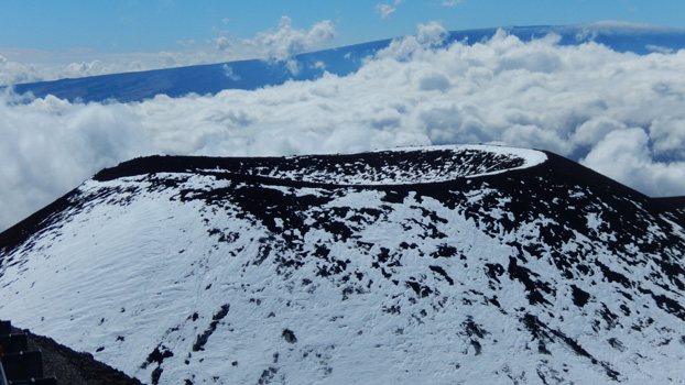 Pünktlich um acht erscheinen wir zum Frühstück, doch außer Kaffee ist nichts fertig. Nach und nach treffen auch die anderen Gäste des B&B ein und nach und nach kommen dann auch Saft, Müsli, Brot und Eierspeise auf den Tisch, aber so langsam, dass wir erst um halb zehn mit dem Frühstück fertig sind! Heute wollen wir auf den Mauna Kea, den mit 4.205 Metern höchsten Berg im Pazifik, fahren. Von der Saddle Road geht es durch Lavafelder stetig bergauf. Dann staunen wir aber nicht schlecht, als nach etwa einem Drittel der Zufahrt der Asphalt endet und ein Schild die Weiterfahrt nur mit Allrad und Untersetzung erlaubt, haben wir doch bei Google Earth gesehen, dass die den Gipfel erreichende Straße asphaltiert ist. Da sich die Straße in gutem Zustand befindet, fahren wir weiter. Die teilweise enorme Steigung und das Wellblech bringen unseren PS-schwachen Wagen gehörig ins Schwitzen. Wir kommen nur hinauf, weil ich die Automatik ausschalte und links fahre, wo weniger Wellblech ist. Kurz vor dem Ziel ist wieder asphaltiert. Auf dem schneebedeckten Gipfel befindet sich eine astronomische Forschungsstation mit mehreren Sternwarten und Teleskopen. Es hat 12 Grad und ist ziemlich windig. Wir blicken auf etliche kleinere Vulkankegel, den ebenfalls schneebedeckten Nachbarvulkan Mauna Loa und auf eine geschlossene Wolkendecke unter uns. Am Nachmittag sehen wir uns Hilo, die größte Stadt im Osten der Insel an. Wir spazieren durch den japanischen Garten und auf das durch eine Fußgängerbrücke erschlossene Cocunot Island (so groß wie eine Kokosnuss).