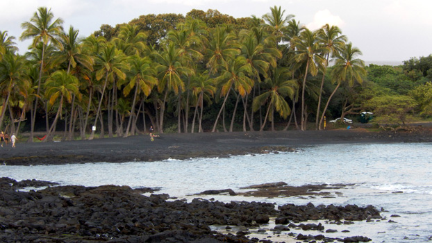 Über die Saddle Road fahren wir zurück nach Kona, um die Küste südlich davon zu erkunden. Es soll hier zwei tolle Buchten zum Schnorcheln geben, doch in der Kealakekua Bay ist die Brandung so stark, dass man sich nicht ins Wasser traut. Es sind außer ein paar Bier trinkenden Hippies keine Leute da. Und in Honaunau Bay ist das Wasser, abgeschirmt durch ein Riff, zwar ruhig, aber es sind so viele Leute, da, dass wir gleich wieder flüchten. Vorbei an Kaffeeplantagen am Fuß des Mauna Loa geht es zum Puuhonua o Honaunau National Historical Parc an, in dem sehr nett die königlichen Hofanlagen (in Form von Steinpodesten mit Hütten drauf) nachgebildet wurden. Wir umfahren den Südteil der Insel, auf dem sich der südlichste Punkt der USA befindet, und entdecken einen fast menschenleeren sehr schönen Lavastrand mit Palmen, an dem wir eine schöne Zeit verbringen. Zurück zum B&B fahren wir an die zwei Stunden. Man unterschätzt die Entfernungen auf der Insel. Nicht umsonst heißt sie Big Island.