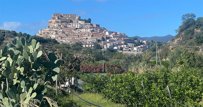 Sonntags und zeitig in der Früh kommen wir staufrei nach Reggio di Calabria. Es gibt auch reichlich Parkplätze, sogar direkt vor dem Dom. Der ist eher klein und auf einen Turm oder gar zwei hat man beim Bau vergessen oder ist das Geld dafür dem organisierten Verbrechen zum Opfer gefallen? Wer weiß. Auch das Castell ist ziemlich winzig ausgefallen. Unsere Fahrt führt nun mit schönen Blicken auf den rauchenden Ätna um die Stiefelspitze Italiens herum. Hier ist alles plötzlich nicht mehr grün, sondern braun, von der Sonne des Sommers verbrannt. Wir fahren zu dem kleinen Dorf Pentedatillo hinauf, das malerisch unter einem Felsen, der an fünf Finger erinnert, gelegen ist. Der Ort ist seit einem Erdbeben 1873 unbewohnt, trotzdem dürfen ein paar Souvenirläden nicht fehlen. Von Amendolea fahren wir auf einer wirklich abenteuerlich steilen Straße mit engsten Kurven zur verfallenen Burg Ruffo hinauf. Von hier könnte man in das Bergdorf Bova weiterfahren, doch die Straße dorthin sieht nicht weniger abenteuerlich aus. Es siegt die Vernunft, wir fahren über den weitaus längeren Weg über die Küstenstraße, wir haben dem Zerberus ohnehin hier schon viel zugemutet. Bova ist wie ausgestorben. Die Straße endet am Dorfplatz und es gibt sogar freie Parkplätze. Ein Espresso und ein Cafe corretto kosten je einen Euro und der Wirt stellt sogar noch selbstgemachten Kuchen dazu. Auf einem weiteren Platz steht, völlig unpassend für ein Bergdorf, eine alte Dampflokomotive. Die hat vor langer Zeit ein Bürgermeister hertransportieren lassen als Zeichen für den Fortschritt. Der allerdingst ist nirgendwo zu sehen. Abends fahren wir noch in die Bergstadt Gerace, wo wir ein nettes Plätzchen für die Nacht finden. Wir sind schon sehr hungrig, finden aber lange kein offenes Restaurant. Manche haben saisonbedingt zu, andere sperren erst später am Abend auf und wieder andere servieren nur Kleinigkeiten. Dann aber findet der Tag bei einer Pizza einen guten Abschluss. Heute war es mit 27 Grad und strahlendem Sonnenschein echt heiß. Km 192/2.511.