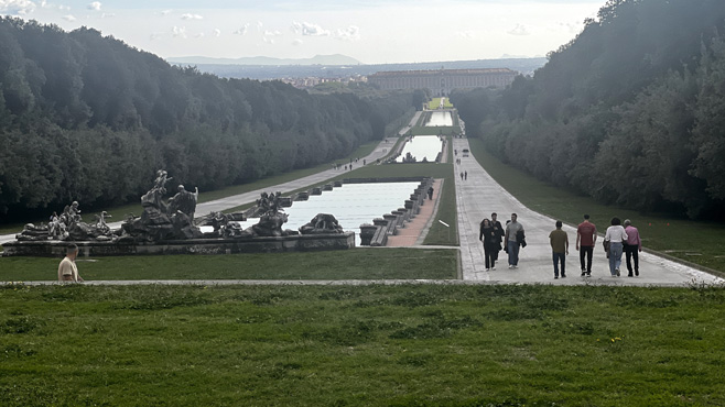 Nach 300 Straßenkilometern verbringen wir den Tag in Caserta. Zunächst sehen wir uns das Schloss San Leucio an, das früher neben pompösen Räumlichkeiten eine Seidentextilfabrik beherbergte und von dem es einen schönen Blick auf den Vesuv gibt. Zum Mittagessen fahren wir hinauf auf die auf einer Anhöhe gelegene mittelalterliche Stadt Casertaveccia. In einem netten Lokal bestelle ich gebratenes Wildschwein, das dann erstens ohne jede Beilage kommt und zweitens völlig ungenießbar ist. Nach einem Bissen sag ich dem Wirt, er kann's wieder abservieren, was er ohne jeden Kommentar auch macht. Sabine ist so selbstlos und lässt mich an ihrer Pizza teilhaben. Wieder unten in Caserta besuchen wir die hinter dem riesigen Schloss (größer als der Buckingham Palace) auf einem Hang gelegene, vier Kilometer lange Parkanlage. Zuerst wollen sie mich mit dem E-Scooter, den ich wegen meiner Gehbehinderung mithabe, nicht in den Park lassen, aber das aufgeklebte Behindertenlogo wirkt Wunder. Sabine muss leider gehen. Die Nachtplatzsuche gestaltet sich sehr schwierig, die Gegend ist praktisch durchgehend dicht besiedelt und ziemlich heruntergekommen, es gibt keinen Platz, an dem man bedenkenlos nächtigen möchte. Wir steuern daher einen teuren Stellplatz am Fuß des Vesuvs an. Km 365/1.376.