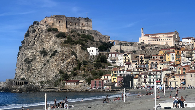 Als würden die Häuser jeden Moment abstürzen, liegt die Altstadt von Tropea auf der Steilküste. Auf einem Felskegel, nur schmal mit dem Land verbunden, befindet sich eine Kirche, zu der Sabine aufsteigt; ich schone mein Bein. Wir halten kurz am Capo Vaticano für einen Blick in die Brandung und machen dann einen verlängerten Mittagsstopp an einem Sandstrand bei Palmi. Leider ist alles total vermüllt, man fühlt sich wie in einem Dritte-Welt-Land, und es dauert eine Weile, bis wir einen halbwegs akzeptablen Platz finden. Es ist sehr warm, wir sitzen lange in der Sonne und nehmen auch ein Bad. An der Strandpromenade in Scilla essen wir ein Eis mit Blick auf die Burg, die über der Stadt thront. In der engen und verwinkelten Ausfahrt aus der Stadt verkeile ich um ein Haar den Zerberus in einer bogenförmigen Unterführung mit unmittelbar folgender scharfer Abbiegung. Einige Kilometer weiter sind wir schon nahe an Sizilien: Messina scheint nur einen Steinwurf weit entfernt. Wir übernachten über Scilla neben einer Kapelle mit Blick auf Sizilien, eigentlich ein toller Nachtplatz, aber es kommen immer wieder Autos, die neben uns parken und dann wieder abfahren. Das macht kein gutes Gefühl, aber im Dunkeln einen neuen Platz zu suchen ist auch keine Option. Km 123/2.319.
