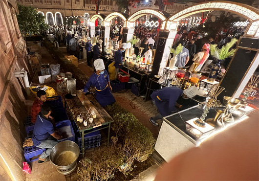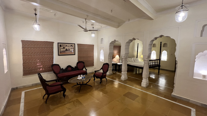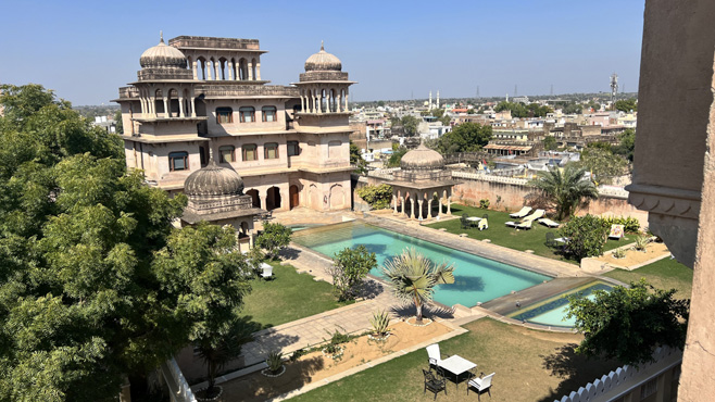 Um halb 6 wecken uns spirituelle Männergesänge aus dem Lautsprecher in einer Lautstärke, die beinahe den kurz darauf einsetzenden Gebetsruf des Muezzins übertönt. Doppelt geweckt. Unser heutiges Ziel ist Bikaner, wo wir wieder in einem alten Gemäuer Quartier beziehen: Lalargh Palace, in seinem schönen Garten und im Besitz der Familie des Maharadschas, beherbergt das märchenhafte Laxmi Niwas Hotel. Kleine Anekdote vom Beziehen des Zimmers: Die Batterie im Safe ist leer, er lässt sich nicht schließen. Kurz nach meinem Anruf an der Rezeption kommt ein Angestellter, der einen neuen Safe in den Kasten stellt, den jeder Hoteldieb bequem als Ganzes mitnehmen könnte. Ich erkläre ihm, warum das keine Lösung ist, woraufhin er verschwindet und nie wieder gesehen wurde. Die Hauptsehenswürdigkeit der Stadt ist das Fort Junagarh, eine beeindruckende Festung und zugleich alter Palast der Maharadschas aus dem 16. Jahrhundert. Die zahlreichen Räume bestechen durch ihre farbenprächtigen Wandmalereien und filigranen Schnitzereien. Ein Museum zeugt von der einst großen, auch politischen, Bedeutung Rajasthans. Wir besichtigen noch den in der Altstadt gelegenen Jain-Tempel Bhandasar und verbringen dann zwei gemütliche Stunden im Garten unseres Hotels und mit einem Mojito am Pool. Morgen findet im Palast eine pompöse Hochzeit statt, die Vorbereitungen laufen auf Hochtouren, überall wird dekoriert, werden Bühnen und Beleuchtung aufgebaut. Im Hotel nebenan, „unserem“ Hotel, wird heute schon der Junggesellenabschied gefeiert in einem Stil, der an eine Oscarverleihung erinnert: Roter Teppich, Glitzernde Kleider (wenngleich hier vielfach Saris), Smokings, Open-Air-Konzert, 200 Meter langes Buffet. Alles vom Feinsten. Fast alles, denn die Gläser werden in Schaffeln mit grauslichem Wasser kurz gespült und wandern gleich wieder zurück zur Ausschank.