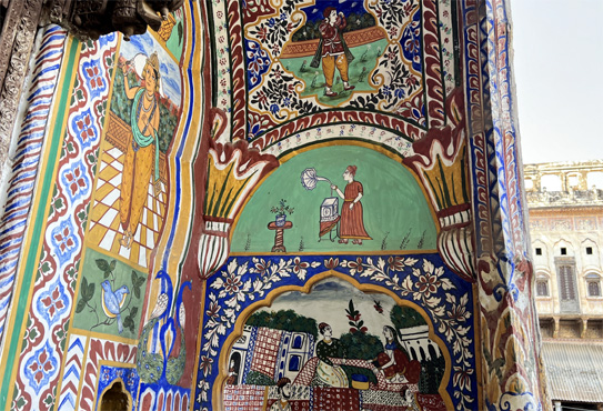 Wir fühlen uns noch ziemlich schwach, bringen zum Frühstück kaum was runter. Heute geht es nach Mandawa, wo wir im Mandawa Castle, wiederum einem stilvollen Hotel, übernachten. Gleich bei der Ankunft begrüßt uns noch auf dem Parkplatz unser Führer für die Stadtbesichtigung. Wir vereinbaren, uns in eineinhalb Stunden hier zu treffen. Unser Zimmer gereicht einem Maharadscha zur Ehre. Beim Auspacken kommt es mir aber komisch vor, dass wir in Mandawa einen Führer haben, denn wir haben nur für die größeren Städte einen gebucht. Dann ist es klar: Der Mann ist eine Fake-Guide. Der stand schon da und wusste gar nicht, wer wir sind und hat sich als unser Führer vorgestellt. Und dann wird er uns nach der Führung abzocken! Wir besichtigen in aller Ruhe das Schloss und machen uns dann ohne Führer auf zur Stadterkundung. In Mandawa gibt es viele, an die 200 Jahre alte, palastähnliche Häuser, die Hawelis genannt werden, und außen wie innen mit bunten Fresken bemalt sind. Leider sind die Sandsteingebäude vielfach in einem schlechten Zustand, in vielen aber sind die Gemälde aufgefrischt, die Alltagssituationen, Heilige, Politiker, eine Eisenbahn, aber auch die Sehenswürdigkeiten von Venedig zeigen. Wir sind schon gut zwei Stunden unterwegs, als uns der motorradberittene Fake-Guide entdeckt und sich beschwert, dass wir nicht wie vereinbart zum Treffpunkt gekommen sind. Wir erklären ihm die Sache, da greift er zum Handy und zeigt uns seinen Auftrag, auf dem unsere Namen angeführt sind. Ich sehe bei unserer Reisebuchung nach: Kein Führer in Mandawa. Er ist trotzdem ungehalten, ich sage, es ist kein Schaden entstanden, wir haben keine Führung gebucht und keine Führung erhalten, er hat keine Führung machen müssen, aber eine Führung bezahlt bekommen. Wahrscheinlich ist ihm um‘s Trinkgeld leid. Wir besichtigen gerade einen Tempel, als auf der Straße fröhliche Musik zu hören ist. Ein mit Tagetes geschmückter Leichnam wird auf einer Bahre zur Einäscherung getragen. Vor der mit bunten Luftballons geschmückten Bahre gehen die Musikanten, dahinter folgen knapp 20 Männer. Ein Trauerzug ohne Trauer. Zum Abendessen sitzen wir auf einer Dachterrasse mit Blick auf die wenig beleuchtete Stadt. Anorak Mitnehmen hat sich ausgezahlt.