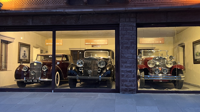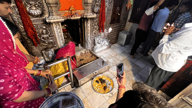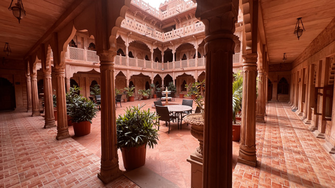 Etwa 30 Kilometer südlich von Bikaner liegt der Karni-Mata-Tempel, eine Sehenswürdigkeit der schrägen Art, denn hier leben – die Angaben gehen weit auseinander – zwischen 5.000 und 20.000 heilige Ratten. Wie in jedem hinduistischen Tempel müssen Besucher die Schuhe ausziehen.aber Touristen dürfen Socken anbehalten. Die Böden im Tempel sind feucht bis nass, der Grund dafür ist hoffentlich, dass öfter mal aufgewischt wird. Die Ratten huschen durch den ganzen Tempel, versammeln sich aber an den Altären, wo ihnen von Besuchern Futter dargebracht wird. Am Rand von Schüsseln mit Milch posieren sie für Fotos und manche lassen sich streicheln. Sie zu berühren oder gar ein weißes Exemplar zu erspähen soll Glück bringen. Gut vorbereitete Besucher wie wir entsorgen nach dem Tempelbesuch ihre Socken, haben Feuchttücher dabei und frische Socken griffbereit. Noch vor Mittag beziehen wir unsere nächste Unterkunft im Fort der kleinen Stadt Khimsar. Es sind kaum andere Gäste da. Wir sehen uns eine Sammlung von lackglänzenden Oldtimern an, spazieren über die Fortmauer und durch die Gärten und haben den Pool ganz für uns allein. Am späten Nachmittag machen wir eine Safari im offenen Geländewagen durch die Wüste, die nicht wirklich eine ist, denn sie ist von niedrigen Stauden und Bäumen bewachsen. Es gibt eine Menge Antilopen und Springböcke zu sehen, auch ein Dromedar läuft uns über den Weg. Dazwischen weiden vereinzelt Kühe, ein seltsames Bild für eine Wüste. An einer Stelle haben sie auf einer Fläche von einem halben Quadratkilometer zwei Sanddünen von jeglichem Bewuchs befreit. Auf der Spitze der einen Düne gibt es eine Bar, vor der man mit Kaffee oder Tee und Snacks auf bequemen Stühlen sitzt und auf einen kleinen See zwischen den Dünen blickt, um den sich Hütten eines kleinen Camps gruppieren. Unsere Bäuche sind mittlerweile wieder soweit hergestellt, dass wir uns trauen, das fantastische Abendbuffet in unserem Hotel durchzukosten. die Geschmacksvielfalt der indischen Küche ist unglaublich!