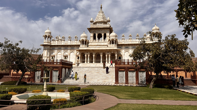 Indien hat sich seit meinem letzten Besuch vor 10 Jahren stark verändert, vor allem hier in Rajasthan: Die Straßen sind gut ausgebaut, der Verkehr ist sehr geordnet, es ist sauber, Armut ist kaum wo zu sehen. In Jodhpur ist erstmals auf unserer Reise ein Zimmer bei unserer Ankunft noch nicht fertig und wir hängen eine Stunde in der Lobby rum. Alles überragend thront die Festung Meherangarh auf einem Felsen inmitten der Großstadt. Die Besichtigung ist ein Genuss. Die Wände etlicher mehrstöckiger Höfe scheinen mit feinen Holzschnitzereien verziert zu sein, doch es ist alles Stein. Neben prunkvollen Räumen gibt es ein Museum, das unter anderem Elefantensitze (ja genau die, die mit Schirm ausgestattet, den Tieren auf den Rücken gebunden werden) und Babywippen zeigt. Von der Festung blickt man auf die Altstadt, wobei in einem Viertel viele blaue Gebäude auffallen, die Häuser der Brahmanen. Wegen dieser Häuser wird Jodhpur auch die Blaue Stadt genannt. Unweit der Festung befindet sich, oberhalb eines kleinen Sees gelegen, das Jaswant Thada, das weiße Marmordenkmal für Maharadscha Jaswant Singh. Von hier überblicken wir die ganze Stadt, aus der in ein paar Kilometern Entfernung der neue Sultanspalast Umaid-Bhawan aufragt. Da wir ja mit privatem Chauffeur unterwegs sind, ist ein spontaner Ausflug dorthin natürlich ganz einfach. Raj navigiert, wie immer, mit dem Handy zwischen den Beinen auf dem Sitz, durch die Stadt. Später halten wir noch an einem riesigen „Antiquitäten“-Laden, der vollgestopft ist mit auf alt getrimmten Deko-Gegenständen. Es sind wunderschöne Sachen, am liebsten möchte man den Laden leerkaufen, aber alles ist völlig überteuert. Im Stadtzentrum lassen wir uns von Raj in der Nähe des Uhrturms absetzen und geben ihm für heute frei. Wir sind noch nicht weit gegangen, schallt eine bekannte Stimme über den Platz: „Hallo Herr Doktor!“ Unglaublich: Unser Reiseführer aus Delhi läuft hier mit Touris herum, kommt auf mich zugestürmt und umarmt mich wie einen Bruder. Es scheint, als wäre er mit dem Trinkgeld zufrieden gewesen. Wir lassen uns durch die Gassen treiben, kaufen auf dem Basar ein paar Gewürze und sitzen dann zum Sonnenuntergang in einem Dachrestaurant mit Blick auf die Festung. Die Lammrippchen Tandoori schmecken vorzüglich, doch sie sind nur zu dritt, sowas von winzig und außerdem nur von ein paar Zwiebelringen begleitet, dass es an einen Skandal grenzt. Schöner Zufall, dass Sabine fast eine halbe Pizza übrig lässt.