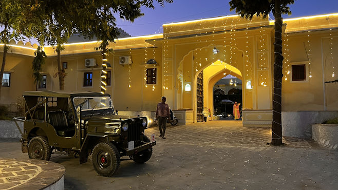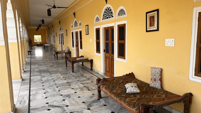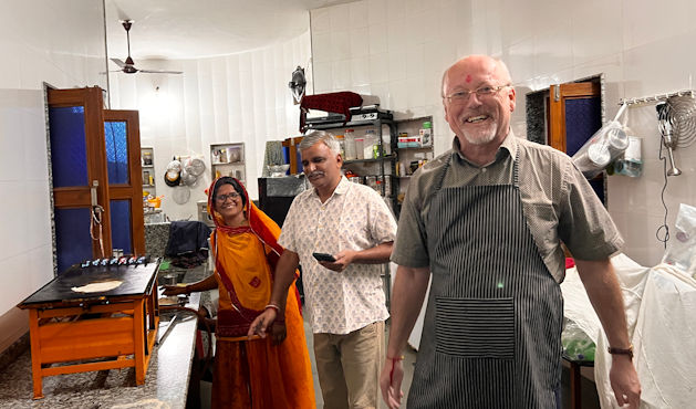Mit Raj haben wir echtes Glück, denn er ist ein guter und sicherer Fahrer und ist stets freundlich und zuvorkommend. Er verdient unseren größten Respekt. Unterwegs nach Chhabariya gibts öfter wieder keinen Handyempfang und Raj ist unsicher, wenn er an Kreuzungen kommt. Obwohl wir ja gar kein mobiles Internet haben, kann ich ihm leicht helfen mit der Navigation, da ich die Offline-Karten von Indien runtergeladen habe. Raj versteht nicht, warum ich navigieren kann und er nicht und schaut mich jedesmal ehrfürchtig an wie einen Guru. Als wir kurz vor zwölf eine Stadt durchfahren, sage ich Raj, dass wir in der nächsten halben Stunde zu Mittag essen möchten und er an einem Restaurant halten soll. Er fährt aber noch aus der Stadt raus und als wir in die nächste Stadt kommen, ist eine Dreiviertelstunde vergangen und mir knurrt der Magen. Er schaut zwar immer nach links und rechts, hält aber nicht an. Nun ist auch hier das Ende der Stadt erreicht und ich frage ihn, ob er denn unseren Wunsch vergessen hat. Hat er nicht, er hat aber nichts gesehen, was unseren vermeintlichen Ansprüchen gerecht wird. Ich sage, er soll umkehren, da wurde doch mehrfach an der Straße gekocht. Er fragt an einer Tankstelle nach einem Restaurant und meint dann, in nur 15 Kilometern gäbe es etwas Nettes. 15 Kilometer sind aber eine halbe Stunde. Ich bleibe dabei, er muss zurückfahren. Gleich beim ersten Imbiss lasse ich ihn halten und siehe da: Eine halbe Stunde später sind wir gestärkt und wieder bester Laune. Es gibt frisch zubereitete, scharfe, heiße Suppe und Tiefkühlpizza. Die Küche hat nur eine Steckdose. Während der Pizzaofen in Betrieb ist, muss der Gefrierschrank pausieren. Unser heutiges Ziel ist das 600-Einwohner-Dorf Chhabariya, das außer einem kleinen Heritage-Hotel mit 12 Zimmern nur aus ärmlichen Häusern, ein paar Tempeln, Staub und Kuhkacke zu bestehen scheint. Im Hotel werden wir wie die Maharadschas mit Trommel begrüßt, die Hausherrin malt uns rote Punkte auf die Stirn, bewirft uns mit Blütenblättern und knüpft uns Bänder an die Handgelenke. All das erscheint uns aufrichtig und authentisch und erinnert kein bisschen an den Zirkus, den sie oft wo für Touristen veranstalten. Wir sind die einzigen Gäste des Hotels, das mit Ausnahme eines Kühlschranks im Zimmer alle Annehmlichkeiten bietet. Der Besitzer macht mit uns einen Spaziergang durch das Dorf und versteht es vorzüglich, aus dem Nichts des Dorfes eine unterhaltsame Tour zu machen. Alle Leute im Dorf grüßen herzlich und im Nu werden wir von einer Schar Kinder begleitet. Die Kids sind unaufdringlich und sauber, die eine oder andere Nisse leuchtet aus dunklen Haaren. An einem winzigen Laden kaufen wir ein Sackerl Zuckerl, die wir verteilen. Die Kinder stellen sich in einer Reihe an und rufen dann im Chor „Thank you Sabine! Thank you Vienna!“ Unsere Gefühle bei der Sache sind zwiespältig. Sabine ist ein Glückspilz, denn in Kuhkacke zu treten, soll hier Glück bringen. Zum Sonnenuntergang nehmen wir einen High Tea auf der Dachterrasse des Hotels ein. Ein neuerliches Getrommle lässt an neue Hotelgäste denken, doch es kommt vom Tempel gegenüber. Und nicht ein Trommler schlägt Pauke und Glocken, sondern eine elektrische Trommelmaschine. Ein Priester und ein paar Gläubige haben sich versammelt, Kinder läuten Glocken und schlagen mit Holzschlägern auf metallene Klangkörper. Der Hausherr bespricht mit uns, was wir zum Abendessen wünschen und lädt uns zum Mitkochen in die extrem saubere Küche ein. Wir kriegen Schürzen und dürfen Chiabati machen, alles andere ist eh schon fertig. Wir dinieren sehr stimmungsvoll bei Kerzenlicht im Freien. Die Nacht ist nicht so ruhig, weil draußen immer wieder Hunde bellen, außerdem nistet ein Meisenpaar in einer Lampe im Zimmer und hinter Bildern und Spiegeln hört man Eidechsen huschen.