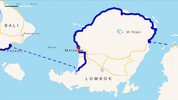 Die Überfahrt dauert vier Stunden plus eine Stunde, die wir wartend vor dem Anleger in Lembar verbringen. Wir fahren durch die Hauptstadt Mataram, die außer einer riesigen Moschee, angeblich, aber kaum zu glauben, eine der größten in Südostasien, nichts besonderes zu bieten hat, und übernachten am nördlichen Stadtrand vor schon geschlossenen Geschäftslokalen. Km 96/7.767/61.411.