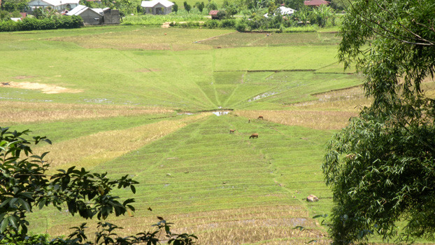 Um halb 3 kommen wir in Labuan Bajo an. Wir fahren nur aus dem Hafen raus, parken in einer Nebenstraße und schlafen noch eine Runde. Flores ist grüner als Sumbawa, aber gebirgiger und daher kurviger und die Straßen sind teilweise recht schmal. Die Trans-Flores-Straße verbindet auf zirka 700 Kilometern die beiden Enden der lang gestreckten Insel von Labuan Bajo bis Larantuka. Es gibt Kirchen, ein großer Teil der Bevölkerung ist katholisch. Vor Ruteng liegen beidseits der Straße so genannte Spinnennetzfelder, große kreisrunde Felder, die durch Erbteilung in sektorförmige Stücke geteilt wurden. Während eines starken Regens können wir das Leck an der Dachluke orten, das sollten wir bei nächster Gelegenheit abzudichten versuchen. Da uns die Kurverei zunehmend nervt, überlegen wir, nicht wie geplant, von Larantuka, sondern schon von Aimere nach Timor überzusetzen. Wenn die uns vorliegenden Informationen stimmen, sollte morgen Früh dort eine Fähre ablegen. Um halb fünf sind wir in Aimere und hören, dass das stimmt, die Fähre geht um acht, der Ticketschalter öffnet um sieben. Wir brauchen noch Bargeld. Bisher konnten wir mit unserer Bankomatkarte in jedem kleinen Dorf problemlos Geld vom Bankomaten beheben, aber Aimere ist kein kleinstes Dorf, sondern nur ein Hafen, möchte man sagen, doch auch das ist übertrieben, es ist eigentlich nur ein verfallender Fähranleger. Es gibt zwar eine Bank, doch akzeptiert deren Bankomat unsere Karten nicht. Auch Geld wechseln ist in dieser Bank nicht möglich. Eine Angestellte empfiehlt uns, 30 Kilometer zurück nach Borong zu fahren. Mist! Dieses Stück war ja extra kurvig und die Straße extra schmal, das dauert über eine Stunde. Ich frage, wo der nächste Bankomat in der anderen Richtung ist. In Bajawa. Wie weit ist das? 30 Kilometer. Wie lange fährt man? Eine Stunde. Gehüpft wie gesprungen. Wir fahren nach Bajawa, das wir bei Dämmerung erreichen, beheben Geld, essen zu Abend und fahren wieder gut eine Stunde zurück. Km 307/8.622/62.266.