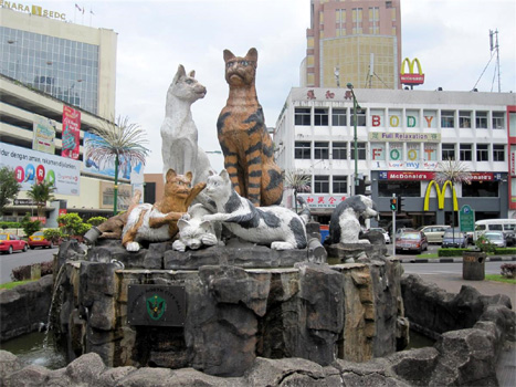 Kuching ist super. Wir mögen die Stadt auf Anhieb. Ku Ching heißt Katze und die Katzen sind allgegenwärtig, in den Souvenirläden, als Denkmal, es gibt sogar ein Katzenmuseum. Die Fahrt hier her war unspektakulär: Bodenwellen, Autobahnbaustellen, Sekundärwälder, Ölplantagen, Pfeffer. In Laching sehen wir uns Liew's Pfefferfarm an. Viel gibt es da nicht zu sehen: Pfefferstauden und eine ausgeklügelte mechanische Vorrichtung, die schöne runde Pfefferkörner von anderem Zeug trennt. Wir kaufen, wie es sich gehört, ein Packerl überteuerten Pfeffer aus eigener Produktion. Dafür dürfen wir unseren Wassertank auffüllen. Mr. Liew ist völlig aus dem Häuschen, weil ich Wasser tanke und nicht Benzin. Er zeigt mir einen Benzinkanister und deutet auf sein Auto. Ich erkläre ihm, dass er für seinen Wagen natürlich Benzin tanken muss. Ist ja ein Toyota und kein Mercedes ... Am Nachmittag sind wir in Kuching. Wir können beim Margherita-Hotel parken. Die nette Dame an der Kassa zeigt mir die Preisliste. Die erste Stunde kostet 4,50, jede weitere 1 Ringgit. Wenn man sein Parkticket verloren hat, bezahlt man 10 Ringgit. Das wird hier wohl öfter vorkommen. Wo hab ich unser Ticket jetzt hingetan? Wir sehen uns zwei chinesische Tempel an und spazieren die Waterfront entlang bis zum Square Tower, von dem man einen guten Blick auf das State Legislative Assembly am anderen Flussufer hat. Sieht aus wie eine riesige Zitronenpresse. In der Nähe befinden sich weitere koloniale Gebäude, Old Courthouse und Alte Post. Zurück geht es durch die Chinatown, an deren Ende einige wirklich nette Lokale gelegen sind, Drunken Monkey, Wrong Place, Sarawak Museum Shop & Cafe, aber nirgends ist was los, das Stadtzentrum ist beinahe ausgestorben. Km 435/5.146/58.914.