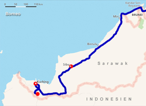 Über Miri und Bintulu geht es nach Sibu, knapp 500 Kilometer. Die Straße ist mit Ausnahme eines Stückes guter Autobahn um Bintulu sehr stark mit Bodenwellen verseucht, so dass ich voll konzentriert fahren und immer wieder abbremsen muss. Auf etwa drei Viertel der Strecke wird an der Autobahn gebaut. Anfangs nur vereinzelt, dann zunehmend häufiger tauchen Langhäuser auf. Das sind, wie der Name schon vermuten lässt, sehr lange Häuser, meist zweistöckig und aus Holz, am ehesten mit einem Reihenhaus vergleichbar. Früher wohnte in einem traditionellen Langhaus ein ganzes Dorf, oft über 100 Menschen, wobei jede Familie einen eigenen Eingang von einer gemeinsamen Veranda hatte. Die Iban scheinen an dieser Wohnform festzuhalten, denn auch neue Häuser sind ähnlich gebaut. Wir hoffen, in den nächsten Tagen alte Langhäuser zu sehen. Etwa 25 Kilometer vor Sibu gibt es einen großen chinesischen Tempel, an dem wir übernachten wollen. Doch das Einfahrtstor ist schon abgesperrt und auf dem Parkplatz davor hängen zwei schräge Typen rum, die gerade über Tempelumzäunung geklettert sind. Wir fahren daher weiter nach Sibu und übernachten an einer Tankstelle. Km 540/4.711/58.479.