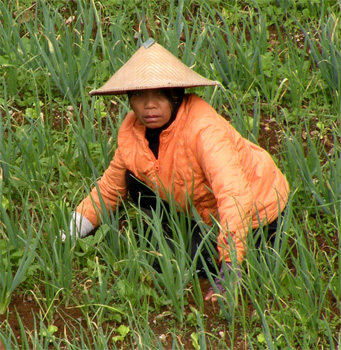 Gleich in der Früh sehen wir uns die Kathedrale an, deren auffälligstes Merkmal die Turmspitze ist, die an die Spitzen von Stupas in Nepal und Laos erinnert. Nur ein paar Schritte weiter befinden sich an einem großen Kreisverkehr mehrere Kolonialbauten, am auffälligsten das Lawang Sewu, das Gebäude der niederländischen Eisenbahngesellschaft, heute teils ein Museum, teils leer stehend. Weil er auf dem Weg liegt, sehen wir uns den großen chinesischen Tempel Klengteng Sampo Kong an. Man bezahlt ein kleines Eintrittsgeld, doch mit dem Ticket darf man nur auf das Gelände, für den Tempel muss man nochmals ein Ticket lösen, allerdings zum dreifachen Preis des ersten. Beim Rausfahren vom Parkplatz kassiert man noch für's Parken. Seltsame Sitten sind das. Beim Tanken stellen wir fest, dass es unrichtig ist, dass Diesel in Indonesien teurer ist als in Malaysia. Im Gegenteil, er ist deutlich billiger, kostet nur 0,36 Euro. Unser nächstes Ziel ist das Dieng-Plateau. Wir nehmen nicht die in großem Bogen verlaufende Hauptstraße, sondern eine "Abkürzung", eine schmale Straße, die sich durch die Berge windet und einen guten Einblick in die intensive Landwirtschaft bietet. Jedes Fleckchen Boden ist genutzt, vielfach sind Terrassen angelegt, es wird bewässert. Reis, Mais, Bananen, Gemüse, in höheren Lagen auch Kartoffeln und noch weiter oben sogar Tee, werden angebaut. Und manches, das wir gar nicht kennen. Das Dieng-Plateau ist der auf gut 2.000 Meter gelegene ebene und landwirtschaftlich genutzte Boden des Kraters eines erloschenen Vulkans. Der Krater ist heute nur mehr von bestimmten Punkten zu erahnen. Die Auffahrt auf das Plateau ist, da wir ja nicht die übliche Straße genommen haben, schlecht. Und eng. Und steil. Und rutschig, weil es schon wieder regnet. Auf dem Plateau gibt es Reste von Ruinen alter Paläste und Hindu-Tempel aus dem 7. und 8. Jahrhundert, mehrere bei Schönwetter bunt schillernde Seen und als Relikte des Vulkanismus Schwefelquellen, deren Dampf schon von weitem sichtbar und riechbar ist. Normaler Weise bezahlt man überall Eintritt, aber bei dem schlechten Wetter kassiert niemand. Wir überlegen kurz, auf dem Plateau zu übernachten, denken aber, dass es in der Nacht zu kalt wird, es hat am Nachmittag nur 15 Grad. Wir fahren also talwärts und finden dann in einem Dorf auf 1.400 Meter eine Art offene Garage, in der wir übernachten dürfen. Heute nehme ich die Verkleidung der vorderen Dachluke ab, um zu sehen, woher das ins Auto eindringende Wasser gekommen sein könnte, finde aber nichts auffälliges. Im Restaurant, wo wir zu Abend essen, treffen wir einen Indonesier, der gut deutsch spricht, er hat zwölf Jahre in Deutschland gearbeitet und zeigt uns stolz seinen EU-Führerschein. Obwohl es täglich Reis gibt, wird das Essen nicht fad, im Gegenteil, es gibt immer wieder Neues zu entdecken. Mittlerweile esse ich kaum mehr Fleisch, weil mir Grünzeug, Blätter und Sprossen viel besser schmecken. Km 121/6.114/59.760.