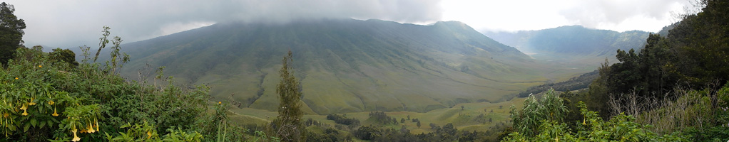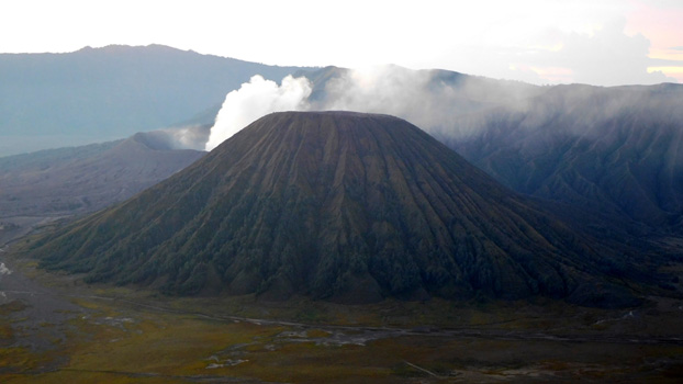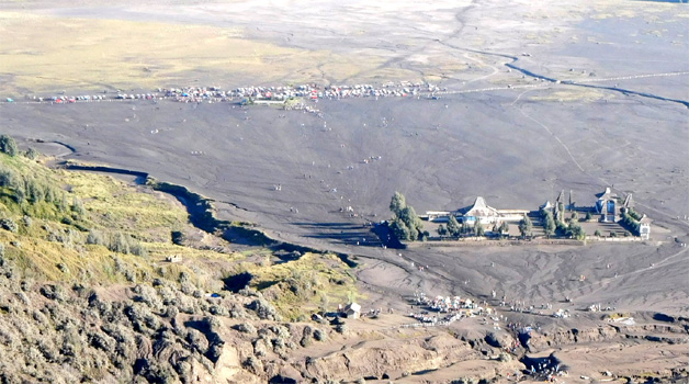 der nahe Mount Semeru spuckt Dampf). Man legt die Strecke zu Fuß zurück oder