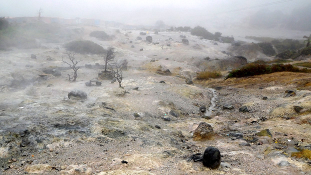 einen Krater aufweist, aus dem nach Schwefel riechender Dampf aufsteigt (auch