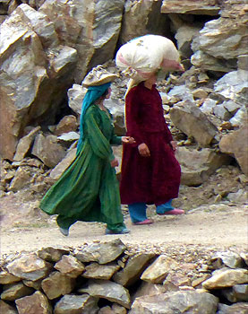 Der Pamir-Highway ist nach dem Karakorum-Highway in China und Pakistan die zweithöchste befestigte Straße der Welt. Sie ist prinzipiell durchgehend asphaltiert, habe ich gelesen. Wir können uns heute davon überzeugen, dass dem nicht so ist. Zu Mittag stoßen wir in Khalaikum auf den Highway, der, ähnlich wie die Straße davor, in weiten Abschnitten nicht geteert ist. Da der Zerberus kein Geländewagen und recht hart gefedert ist, kommen wir nur langsam voran. Am Abend beträgt die Durchschnittsgeschwindigkeit des Tages 26 km/h. Mal gut achteinhalb Stunden reine Fahrzeit macht gerade mal 225 Kilometer. Immer wieder staunen wir, dass Sattelschlepper die stellenweise sehr schmale und oft recht steile Straße fahren. Den ganzen Tag haben wir links Berge, rechts den Panj und drüben in Afghanistan meist auch eine Straße oder zumindest einen Weg und ebenfalls Berge. Das Tal ist oft so schmal, dass wir recht genau beobachten können, was in Afghanistan vor sich geht. Wir sehen Frauen beim Teppich Waschen, Kinder in der Schule und beim Fußballspiel, Menschen auf dem Weg, zu Fuß mit Lasten auf dem Kopf oder begleitet von Lasteseln, auf Mopeds, fallweise mit Autos. Aber auch herüben in Tadschikistan gibt es Interessantes zu sehen: Kühe, die wie Gemsen auf steilsten Geröllhalden Halme suchen, später wiederkäuend am Straßenrand liegen, Pferde mit frisch geworfenen Fohlen, Menschen, die mit einfachsten Werkzeugen auf dem Feld arbeiten. Km 225/15.454.