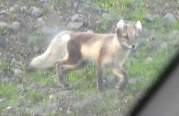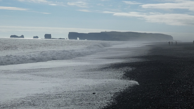 Leider sind unsere Bordbatterien (schon wieder!) am Ende. Am Morgen ist nicht mehr genug Saft für die Heizung drin. Wir lösen das Problem höchst elegant, indem wir über Nacht den Kühlschrank abschalten, dann können wir in der Früh heizen. Heute scheint schon am Morgen die Sonne und wir werden warme 18 Grad bekommen. Über viele Kilometer durchfahren wir Sander, flaches und ödes Schwemmland. Dann halten wir in Nupsstadur, einem idyllisch am Berghang gelegenen, stillgelegten, alten Bauernhaus mit Torfkellern und einer winzigen Kirche samt Friedhof. In Kirkjubæjarklaustur gibt es mitten auf einer Wiese ein "Kirkjugólf" genanntes, wie mit Steinen gepflastert aussehendes Areal, von dem man früher vermutete, es sei der Boden einer verfallenen Kirche. Es handelt sich aber um Basaltsäulen, deren Oberfläche durch Verwitterung geglättet wurde. Am Fjaðrárgljúfur, einem etwa hundert Meter tiefen Canyon, gehen wir nicht den steilen Weg zum Aussichtspunkt hinauf, sondern finden ein Sträßchen, von dem aus wir ihn halbwegs eben erreichen. Nun führt die Ringstraße über zig Kilometer durch ein Lavafeld, das durch einen Vulkanausbruch 1783/84 entstanden ist. Die Lavabrocken sind von dickem Moos überzogen, aber sonst gibt es, außer spärlichen Grasbüscheln dort und da, noch immer keinen Bewuchs. Die Kirche in Vík kommt uns sehr bekannt vor, ziert sie doch den Umschlag unseres Reiseführers. Wir spazieren am schwarzen Strand bis zu Klippen, in denen viele Vögel nisten. Auf der anderen Seite dieser Klippen liegt der Strand Reynisfjara. Leider ist es hier ziemlich überlaufen, alle wollen die Basaltsäulen sehen, außerdem hat man einen schönen Blick auf das Kap Dyrhólaey. Das Kap sieht aus der Ferne wie eine Insel aus, doch es ist über eine schmale Landbrücke erreichbar. Eine sehr steile Schotterpiste führt zum Leuchtturm hinauf. Die Aussicht ist grandios. Wir campieren in einer Schottergrube ein wenig abseits der Ringstraße. Während ich am Computer arbeite, läuft ein Polarfuchs ganz nah am Zerberus vorbei. Km 212/699/2.631/138.278.