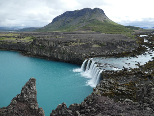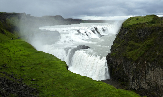 Auf dem Weg zu Islands vielleicht bekanntestem Vulkan, der Hekla, liegt der Wasserfall Thjófafoss, der sich in einen smaragdgrünen See ergießt. Die Hekla trägt über einer Schneekappe fast immer eine Wolkenhaube, auch uns ist ein ungetrübter Blick auf den Berg nicht vergönnt. Aber man kann bis fast ganz hinauf auf das 1.491 Meter hohe Massiv fahren. Zumindest theoretisch. Für uns ist auf etwa 850 Meter Schluss, da ab hier die Piste nicht mehr gewartet wird und tiefe Längsgräben das Fahren fast unmöglich machen. Ein Geländewagen eines Tour Operators kommt 50 bis 100 Meter höher, aber dann ist auch für ihn Endstation. Aber auch wenn wir nicht den Gipfel erreichen, der ohnehin in Wolken liegt, der Blick über unendliche Lavafelder und etliche Krater unter uns ist überwältigend. Auch die Strecke zu zwei weiteren bekannten Wasserfällen, Háifoss und Gullfoss, ist weitgehend nicht asphaltiert und mehr oder weniger rumpelig. Háifoss ist mit 128 Metern der höchste Wasserfall und Gullfoss mit 170 Metern Breite vielleicht der spektakulärste. Am Abend sehen wir uns noch den Geysir an. Nicht irgendeinen, sondern den. Den Urgeysir, der allen anderen den Namen gegeben hat. Er ist leider nur mehr höchst selten aktiv, doch gleich daneben spuckt der Strokkur alle paar Minuten eine Fontäne in die Luft. Wir übernachten ganz in der Nähe auf dem Campingplatz Skjól. Km 251/1.035/2.967/138.614.