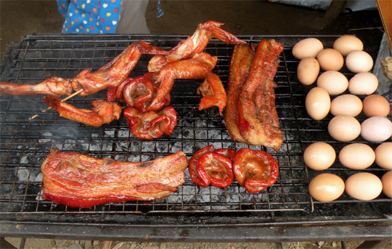 gegrillten Schweinebauch, gegrillte dünne Hühnerbeine, gegrillte Eier und