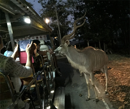 In Bangkok hat es 29 Grad und wir schwitzen sogar im klimatisierten Flughafengebäude. Wir müssen durch die Passkontrolle, dann unser Gepäck vom Band holen und für den Flug nach Chiang Mai neu aufgeben. Obwohl der Flughafen sehr groß und etwas unübersichtlich ist, geht sich das in einer dreiviertel Stunde aus. In Chiang Mai, wo es übrigens 37 Grad hat, werden wir von Herrn Atikul, dem Service Manager bei Mercedes, persönlich vom Flughafen abgeholt und zum Zerberus gebracht. Der ist sozusagen runderneuert: Neue Windschutzscheibe, neues Türscharnier, Turbo funktioniert wieder, Delle ist weggemacht. Eine Versicherung, wie versprochen, können wir leider nicht abschließen, wir fahren weiterhin ohne Haftpflichtversicherung in Thailand. Nach einem Einkauf im Supermarkt sehen wir uns noch den Chedi-Luang- und den Phra-Sing-Tempel an, dann geht es durch die einsetzende Abendstoßzeit raus aus der Stadt und obwohl wir schon sehr müde sind, besuchen wir noch die Chiang Mai Night Safari, einen mit 800 Baht = 22 EUR p.P. ziemlich teuren, aber nett angelegten Zoo, den man nächtens auf offenen Wagen durchfährt. Allerlei Getier kommt zum Greifen nahe, Karnivoren befinden sich vernünftiger Weise immer hinter Zaun. Wir übernachten auf einem Parkplatz des Zoos. In der Nacht regnet es, aber ich schlafe so tief, dass ich lange nicht bemerke, dass es durch die Dachluke genau auf meinen nackten Po regnet. Km 21/21/44.422.