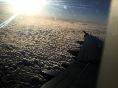 dem man einen Blick auf die im Dunst liegende Stadt und den Flughafen hat. Hier