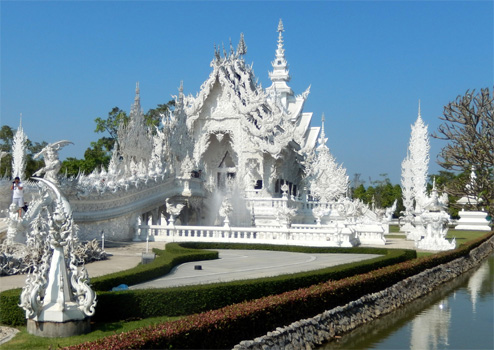 Die Nacht war kalt und ich erwache mit Halsschmerzen. Habe ich mich verkühlt? Chiang Rais außergewöhnlichste Sehenswürdigkeiten, der Weiße und der Schwarze Tempel, befinden sich südlich und nördlich, jeweils einige Kilometer außerhalb der Stadt. Von Süden kommend, sehen wir uns zuerst den Weißen Tempel, Wat Rong Khun (Eintritt gratis) an, eigentlich eine Anlage von etwa einem Dutzend weißer Tempel. 1997 wurde mit dem Bau des Hauptgebäudes begonnen, einige Bauten sind noch unvollendet. Diese Bauwerke zu beschreiben, ist nicht leicht, denn so etwas Schräges haben wir noch nie gesehen. Aus einiger Entfernung sehen die Gebäude wie aus Porzellan gefertigt aus. Dieser Eindruck entsteht dadurch, dass in die weißen Fassaden viele tausende kleinste Spiegel eingelassen sind. Alles weiß, bis auf ein Gebäude, das golden glänzt: die Toiletten. Die Tempel sind verschnörkelt und mit klassischen Motiven, wie Drachen und Kriegern verziert. Daneben gibt es aber völlig irreale Elemente, wie eine Science-Fiction-Figur auf einer Bank, unzählige aus dem Boden ragende Hände und von Bäumen hängende Köpfe. Das Innere des Hauptgebäudes ist mit buddhistischen Motiven zum Thema Leid und Wiedergeburt mit dominierendem Orange ausgemalt. Daneben finden sich aber auch Superman, Spiderman und Batman, Elvis Presley und Michael Jackson, sowie die brennenden Twin Towers. Wenn wir nun denken, schräger geht's nicht, so haben wir uns getäuscht, denn der Schwarze Tempel Baan Dum nördlich der Stadt (Eintritt ebenfalls gratis) steht dem Weißen in punkto Skurrilität um nichts nach. In einem Park befinden sich an die zwanzig zumeist dunkle Gebäude, die meisten aus Holz und mit hohen Giebeln wie Tempel aussehend. Einige Gebäude sind weiß und gemauert; auch diese Anlage scheint noch nicht vollendet. In den Gebäuden befinden sich riesige Tische mit Stühlen aus Hörnern und Geweihen. Auf den Tischen liegen Krokodil- und Schlangenhäute, Felle und Tierzähne und alle Gebäude sind gruselig dekoriert. Einfach total schwer zu beschreiben, musst du selber sehen. Auf der Fahrt vom Weißen zum Schwarzen Tempel machen wir eine Stadtrundfahrt - Chiang Rai ist eine durchaus sympathische, aber wenig sehenswerte Stadt - und essen in einem netten Lokal Noodles with Chicken, wobei, wenn man Füße, Federn, Knochen und Röhren wegrechnet, kaum Chicken in der Schale ist. Am späten Nachmittag fahren wir noch ein ordentliches Stück Richtung Südosten. Wegen des mageren Mittagessens haben wir bald Hunger und halten in Chiang Kham an einem Stand, wo Bratwürste auf dem Griller liegen. Wir kaufen drei Stück und bezahlen samt ein wenig Krautsalat mit Ingwer und Chili, unglaubliche 15 Baht (0,40 Euro). Erst beim Essen wird uns klar, dass die Bratwürste mit Reis und nur vereinzelt Speckstücken gefüllt sind. Sie schmecken aber trotzdem hervorragend. Da ich schon ziemlich erschöpft bin - ein Blick in den Hals ließ mich zu Mittag eine Angina diagnostizieren, wollen wir nicht mehr weit fahren. Wir biegen in den Hof des nächst besten Klosters ein und ersuchen um Asyl. Gar kein Problem, wir können gerne hier übernachten. Später am Abend kommt noch die Oberin mit dem Moped angefahren, erkundigt sich nach dem Woher und Wohin und ist besorgt, dass es uns an nichts mangelt. Km 177/947/45.349.