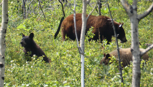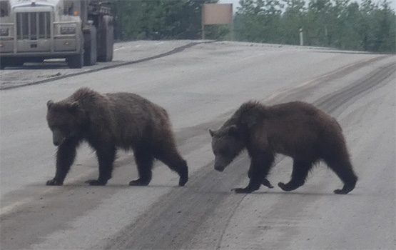 Weiter geht es durch endlose Nadelwälder und immer wieder vorbei an Ölbohrstellen. Häufig bringen von diesen in den Highway einbiegende LKW reichlich Erde auf die Fahrbahn. Da es immer wieder mal regnet, überziehen vor uns fahrende und entgegenkommende Fahrzeuge den Zerberus mit einer dicken Dreckschicht. Vielleicht weil wir dadurch gut getarnt sind, nehmen zwei über die Straße trottende Grizzlybären keine Notiz von uns, legen sich sogar am Straßenrand nieder. In Grande Prairie ist die Tiefebene nordöstlich der Rocky Mountains erreicht. Der kleine Ort Beaverlodge ringt mit einer großen Biberstatue um Aufmerksamkeit.