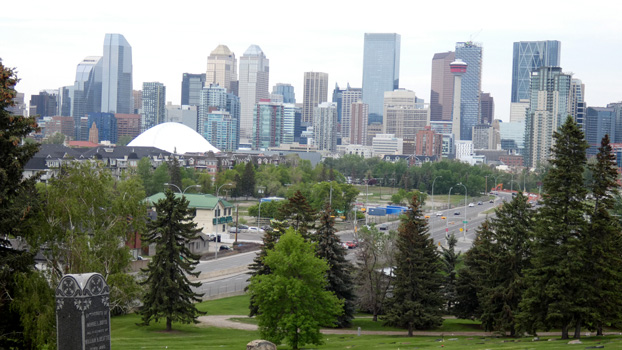 Die Landschaft ist wieder flach, Felder und Wiesen wechseln sich ab. Es wird viel bewässert, auch die Weideflächen. In Fort Macleod sehen wir uns die historische Main Street und das restaurierte Fort an. Auf halbem Weg nach Calgary machen wir Halt in Vulcan, einer 2.000-Seelen-Gemeinde, die nach dem römischen Feuergott benannt wurde. In den 90er-Jahren hat sich das Dorf zur Star Trek-Hauptstadt Kanadas erklärt und seither treffen sich jährlich Raumschiff Enterprise-Fans aus aller Welt zu den Spock Days. Natürlich gibt es ein Raumschiff und ein Vulkanier-Zentrum, in dem man sich Vulkanier-Ohren oder einen Phaser kaufen kann. In Calgary gibt es eigentlich keine besonderen Sehenswürdigkeiten außer dem in den 60er-Jahren erbauten Calgary Tower, der heute von vielen Hochhäusern überragt wird. Wir begnügen uns mit einem Blick vom auf einem Hügel gelegenen Union Cemetery auf die Skyline. Gleich neben der Mercedes-Werkstätte gibt es einen Walmart, auf dem schon acht oder zehn Wohnmobile stehen. Zum Abendessen gibt es wieder ein leckeres Rindersteak. Rindfleisch ist sehr günstig in Kanada, kostet kaum mehr als Schwein. Wär nicht gleich der Walmart nebenan, müssten wir warmes Bier trinken, denn der Kühlschrank ist ausgefallen. Gott sei dank ist es nur der Schalter, der ist schnell repariert, der Lötkolben wurde nicht umsonst eingepackt. Das Ladegerät des Satellitentelefons hingegen ist irreparabel kaputt, auch kein Malheur, wir haben ein zweites mit und auch die Sicherungen, die seinetwegen durchgebrannt sind, sind rasch ersetzt. Km 335/9.374/107.930.