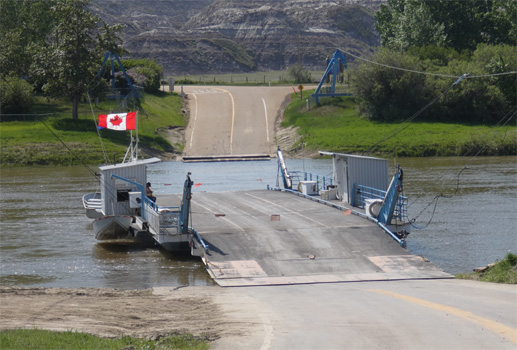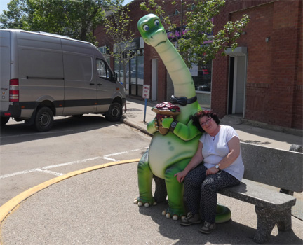 Bei Mercedes sind sie nicht begeistert, dass wir kommen, ohne einen Termin vereinbart zu haben. Dann erbarmt sich doch einer und hängt den Zerberus an den Diagnosecomputer. Es ist kein Fehler zu finden. Nach einem Reset funktioniert der Turbo wieder und nach ein paar Kilometern ist auch die Motorkontrollleuchte wieder weg. Vermutlich war also doch nur der nicht befestigte Luftschlauch des Schnorchels (böser Mechaniker in Toronto!) Schuld an den Troubles. Wieder mit voller Kraft geht es nach Rosedale, wo wir uns die Hoodoos genannten Sandsteinformationen und die Hängebrücke über den Red Deer River ansehen. Weil in der Region Dinosaurierskelette gefunden wurden, dreht sich in der Kleinstadt Drumheller alles um die Dinos. Sie stehen, naturfarben oder bunt, überall in der Stadt herum. Als besondere Attraktion gibt es hier die weltweit größte Dinosaurierattrappe, 46 Meter lang und 26 Meter hoch. Auch die Straßen sind nach verschiedenen Saurierspezies benannt. Der Red Deer River hat hier einen breiten Canyon gebildet, durch den wir fahren. Einmal führt die Straße zu einem Aussichtspunkt hinauf, dann wieder ins Tal hinunter. Mit einer kostenlosen Seilfähre überqueren wir den Fluss, der kaum doppelt so breit wie die Fähre lang ist. Der Fährmann führt Buch über beförderte Fahrzeuge und Personen. Heute hat er schon sechs Mal übergesetzt. Ein Traumjob! An einem weiteren Aussichtspunkt wollen wir campieren. Wir sitzen eine Weile in der Sonne, doch dann wird der Wind ungemütlich und wir fahren zurück nach Drumheller, wo wir im Stadtpark übernachten. Km 239/9.613/108.169.