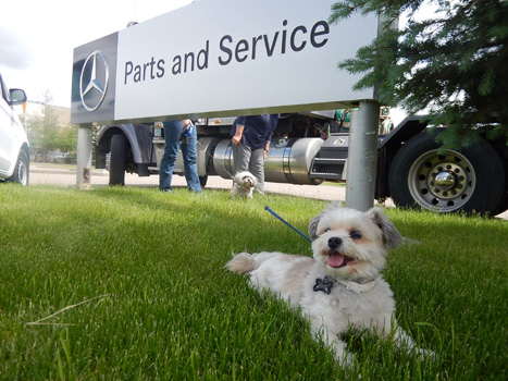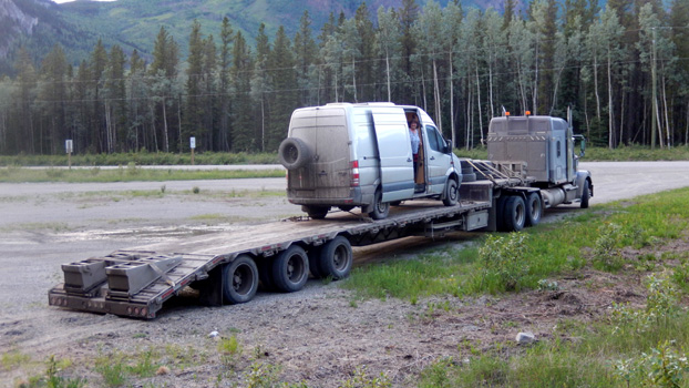 Zu Mittag erreichen wir Edmonton. Gord wäscht den total verdreckten Laster und dessen genauso schmutzige Ladung und dann stehen wir nach fast 3.000 Kilometern Huckepack vor der Mercedes-Werkstätte. Gord ruft einen Abschleppdienst, weil wir zum Abladen einen Autotransporter benötigen. Der Abschied von Nadina und Gord und den Hunden fällt uns schwer, wir haben uns sehr angefreundet. Bei Mercedes sitzen wir zunächst drei Stunden rum. Dann ist es Gewissheit: Der Zerberus hat einen Motorschaden. Ein neuer Motor ist in Nordamerika nicht verfügbar, weil die Sprinter hier alle Benzinmotoren haben. Es gibt daher hier mit Garantie auch keinen gebrauchten. Somit gibt es eigentlich nur zwei Möglichkeiten: Erstens einen neuen oder gebrauchten Motor aus Europa kommen lassen. Über die Kosten haben wir zur Zeit nicht einmal ansatzweise eine Vorstellung. Zweitens das Auto verschrotten lassen, denn verkäuflich ist er sicher nicht. In beiden Fällen könnten wir entweder in den nächsten Tagen heim fliegen oder mit einem Miet-Wohnmobil die Reise fortsetzen. Vielleicht sollten wir mal drüber schlafen. Das dürfen wir übrigens im Zerberus hinter der Werkstätte.