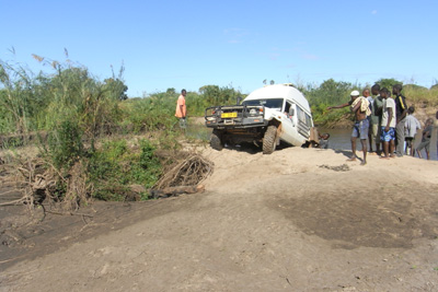 Freitag, 13. Mai 11, Tag 27, Albtraum## Wir wollen nicht wieder bis auf die Nationalstraße landeinwärts, sondern näher an der Küste auf einer Piste nach Norden. Es geht zwischen Feldern und durch Dörfer, der Weg ist anfangs recht schlecht, wird dann aber ein wenig besser, viele Brücken sind zu passieren. Doch dann, schon im letzten Fünftel der Strecke bis Quissange, von wo wir dann auf die Nationalstraße fahren wollten, fehlt eine Brücke. Sie wurde offensichtlich weggespült. Der Fluss ist zirka 20 Meter breit, hat deutliche Strömung, ist aber nicht sehr tief, wir sehen Fußgänger durch den Fluss waten und Radfahrer ihre Drahtesel hinüber tragen. Ich frage nach einer Umleitung. Könnte ja sein, dass schon eine Behelfsbrücke gebaut oder eine Furt angelegt wurde. Nein, gibt es nicht, mit dem Auto kommt man nicht rüber. Das heißt: Fast 100 Kilometer auf Holperpiste zurück und die gleiche Strecke auf der Nationalstraße wieder rauf, also 200 Kilometer Umweg, der zumindest fünf Stunden beansprucht. Ich sehe mir die Lage genauer an: Flussaufwärts ist das Ufer beidseits sehr steil, fast senkrecht und gut einen Meter hoch bis zur Wasseroberfläche. Unmöglich. Flussabwärts, dort wo die Fußgänger queren, könnte man vielleicht in den Fluss fahren, aber es ist nur ein Fußweg ausgetreten, beidseits davon steht Schilf und ist der Boden schlammig. Ich gehe durch den Fluss, der ist halbwegs gleichmäßig knapp knietief und der Untergrund sandig und fest. Drüben aus dem Fluss zu kommen, würde schwierig werden und falls es gelänge, müsste man dann ganz scharf die Richtung um 90 Grad ändern und auf einem ähnlichen Steig wie drüben auf die Straße fahren, wobei da nochmals zwei heftige Stufen zu bewältigen wären. Es könnte klappen. Ich sehe mich nach Bäumen um, an denen man sich im Falle des Falles mit der Seilwinde rausziehen könnte. In der Nähe gibt es nur Büsche; Bäume sind in in der Entfernung einer Seillänge nicht vorhanden. Aber es sind genügend Leute anwesend, die gegebenenfalls anschieben könnten, denn es haben sich schon gut 20, wenn nicht 30 Männer versammelt, die mit Interesse auf unsere Entscheidung warten. Wir wollen es versuchen. Ich übersiedle heikle Fracht, wie Notebook und andere elektronische Geräte in den ersten Stock und helfe Susi zu Fuß ans andere Ufer. Dann geht's los. Obwohl ich die linken Räder ganz knapp an der Uferkante halte, drückt es die rechten schon ordentlich in den Schlamm, dennoch komme ich problemlos bis an's diesseitige Ufer. Bevor ich in den Fluss fahre, muss ich am anderen Ufer die Böschung abgraben. Ich hole die Schaufel aus dem Keller, die mir ein Tatkräftiger aus der Hand nimmt und zusammen mit einigen anderen, die mit den Händen arbeiten, die Böschung bearbeitet. Ich fahre in den Fluss und komme auch problemlos bis zur Mitte, doch dann gräbt sich unser Buschtaxi plötzlich ein. Offenbar war der Grund doch nicht so fest, wie ich beim Durchwaten den Eindruck hatte, oder bin ich zu langsam gefahren? Jedenfalls komme ich trotz schiebender Menge weder vor noch zurück. Das Wasser steht bis zur Vordertürunterkante, schwappt gerade nicht herein. Ist also gar kein Grund zur Panik. Schauen wir mal, wie weit das Seil der Winde reicht. Das erste Bäumchen, das eigentlich eher ein Strauch ist, entwurzle ich problemlos. Mittlerweile steigt der Wasserpegel und ich habe Wasser im Fußraum. Dann zeigen mir meine Helfer ein Bäumchen, das doch ganz ansehnlich gebaut ist, das aber deutlich weiter weg ist. Bergegurt und Baumschutzgurt müssen raus. Leider noch immer zu kurz. Nach einer Verlängerung mit dem Abschleppseil geht sich's grade aus. Das ist vielleicht Zentimeterarbeit! Dieses Bäumchen hält und ich ziehe mich bis ans Ufer. Nun bin ich aber nicht an der Stelle gelandet, wo wir die Böschung abgegraben haben, sondern wo es sehr steil ist. Das Bäumchen steht nun leider in der falschen Richtung, um mich an ihm die Böschung hinaufzuziehen. Wir suchen nach einem neuen Haltepunkt, für den eigentlich nur ein Strauch in Frage kommt. Ob der halten wird? Wir versuchen es, doch es schneidet sich das Seil in die Böschung ein, das Auto bewegt sich nicht. Ich lasse Baumstämme bringen, die wir dem Seil unterlegen, und jetzt hebt sich die Schnauze unseres Buschtaxis. Stück für Stück kommt es nun aus dem Wasser und steht am Ufer, allerdings mit den Vorderrädern schon wieder im Matsch. Plötzlich funktioniert auch die Steuerung unserer Seilwinde nicht mehr. Anscheinend ist hier Pause. Wir stellen uns auf zwei oder drei Tage Warten ein, dann ist es hier trocken und wir fahren problemlos rauf auf die Straße. Ich teile unseren Helfern den Entschluss mit, weiß aber nicht, ob sie das verstanden haben. Als ich Werkzeug, Gurte und Seil einpacke, nehmen mich die Anführer der Truppe beiseite und präsentieren ihre Forderung für die Hilfe: 3.000 Metical für alle. Das sind knapp 70 Euro. Da es sein könnte, dass wir in zwei oder drei Tagen nochmals Hilfe brauchen, versuche ich nicht, den Preis zu drücken, sondern verspreche, dass es die 3.000 gibt, aber erst wenn wir wieder auf der Straße stehen. Plötzlich entsteht eine Unruhe in den Helfern, jeder hat einen Plan, Rufe und Kommandos gehen durcheinander. Jedenfalls wollen alle sofort weitermachen. Die einen fangen mit Schaufel und Händen an, die Räder auszugraben, andere reißen tonnenweise Äste von den Büschen und legen sie vor die Räder, wieder andere graben die nächste Böschung ab. Und es klappt: Kurze Zeit später stehe ich auf der Straße. Es gibt ein Freudengeschrei, wie man bei uns noch keines gehört hat. Leider haben wir nur mehr knapp 1.500 Metical, weil wir in der Früh in Pemba vollgetankt haben. Ich gebe noch einen 50-Dollar-Schein dazu und erkläre den Helfern, dass das nun 3.000 Metical sind. Wider Erwarten glaubt man mir das und alle bedanken sich überschwänglich und wünschen uns gute Fahrt. Alles in allem hat die Bergeaktion 4 Stunden gedauert. Susi war ü
