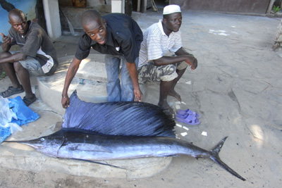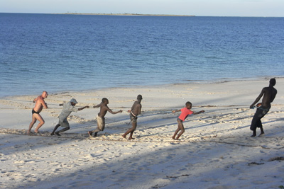 Mittwoch, 11. Mai 11, Tag 25, Mossuril Herrlich! Vor dem Frühstück eine Runde schwimmen. Wir vertrödeln den Tag an diesem wunderschönen Ort, Trägheitsmoment und Faulheitsquotient steigen von Stunde zu Stunde. Wir sitzen gerade lesend auf unseren Klappstühlen, die Beine auf den Stockerln, als sich zirka 20 Zentimeter neben den Stuhlbeinen eine Schlange vorbeischlängelt. Der Schreck ist groß, denn das Tier ist gut einen Meter lang und kräftig gebaut. Ganz in der Nähe haben Fischer ihre Einbäume stationiert, mit denen sie auf's Meer hinausgefahren sind. Nach Mittag kriegen wir dann fangfrischen Fisch angeboten. Der Fisch, den wir kaufen, sieht so aus, wie wir uns einen Seehecht vorstellen. Ich nehme ihn aus und schneide ihn in drei Teile, damit er in die Pfanne passt. Dann kommt er bis zum Abendessen in den Kühlschrank. Nun kommt der Typ vorbei, bei dem wir gestern die Gemeindeabgabe bezahlt haben. Er lässt uns wissen, dass wir nicht noch eine Nacht hier bleiben können, "weil Banditen unterwegs sind". Wir sollen doch den nahe gelegenen Campingplatz aufsuchen. Ein wenig später fahren wir zum Campingplatz, doch der kommt gar nicht in Frage, weil er nicht direkt am Strand ist. Wir finden aber ein sehr schönes Plätzchen direkt am Meer. Hier legen gerade Fischer mit einem Boot ein Netz aus und holen es dann händisch vom Strand aus ein. Um ihnen hallo zu sagen, helfe ich beim Netz reinziehen. Der Fang ist eher bescheiden: nur kleine und kleinste Fische, ein paar Tintenfische, zwei Seeigel. Ich krieg für meine Hilfe einen kleinen Fisch geschenkt, der später unserem Seehecht in der Pfanne Gesellschaft leistet. Km 7/5.668/49.210.