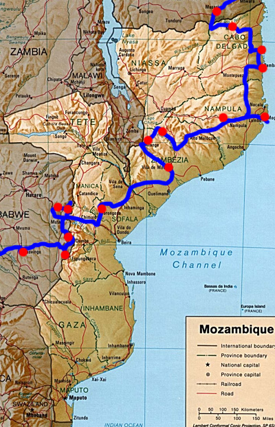 Auf mosambikanischer Seite dauert's ein wenig länger, gut eine Stunde. Weil die Beamten nicht Englisch sprechen (wollen), müssen wir uns eines Helfers bedienen, der kein Honorar verlangt, sofern man bei ihm Geld wechselt. Auf der einen Seite geht alles furchtbar altmodisch zu, etwa wird unsere Einreise in mehreren Büchern händisch protokolliert, andererseits kriegen wir ein ultramodernes Visum mit Webcam-Foto und codiertem Fingerabdrücken in den Pass geklebt. Das hat natürlich seinen Preis. Nämlich 72 USD = 50 EUR. Das Carnet wird vom Zoll anerkannt, nur falsch gestempelt. Tut ihm leid, hat er grad zum ersten Mal gemacht, sagt er. Auf Englisch übrigens. Die obligate Versicherung kostet 530 Mt = 12 EUR. Weitere Kosten wie Road-Tax oder Carbon-Tax fallen nicht an. Da mir der Wechselkurs unseres Helfers nicht schlecht vorkommt, tausche ich unsere verbliebenen 3.000 südafrikanischen Rand in 12.000 Mt. Dann können wir endlich die Grenzstation verlassen. Langsam fahren heißt die Devise, denn es sind sehr viele Menschen auf der Straße. Die meisten zu Fuß, es sind viele Kinder dabei. Alle tragen was auf dem Kopf: Säcke, Körbe mit Bananen oder Orangen, Töpfe mit Geschirr zum oder vom Abwasch, Körbe mit Wäsche, Werkzeug, leere oder volle Wasserkanister ... Viele Frauen oder größere Kinder haben Säuglinge umgeschnallt, auffälliger Weise meist nicht auf dem Rücken, sondern vorne. Manche sind mit Fahrrädern unterwegs und transportieren dabei Säcke mit Holzkohle, Obst, Heu, Holz ... Die Straße ist praktisch lückenlos gesäumt von Verkaufsständen, an denen alle erdenklichen Waren verkauft werden: Obst, Gemüse, Kleidung, Aufladebons für Handys, Schuhe, Möbel, die gleich nebenan hergestellt werden, ... Da es in Zentralmosambik nur 11 Einwohner pro Quadratkilometer gibt, meint unser Reiseführer, Auflage 2010 diesmal, muss es eigentlich abseits der Straße menschenleer sein. Ist es aber nicht, im Gegenteil. Nachdem wir von der ostwärts führenden Straße nach Beira nordwärts abgebogen sind, suchen wir in der Nähe des Mont Gorongosa einen Nachtplatz, doch jeder Weg, der von der Hauptstraße abzweigt, ist bevölkert und landet sofort in einem Dorf. Schließlich finden wir eine Wiese, die uns zum Übernachten geeignet erscheint. Es ist der Sportplatz des Dorfes. Ein paar Jugendliche kommen und ich frage sie, ob wir da bleiben können. Sie glauben schon, aber wir müssen den Chief informieren. Also ab zum Häuptling. Er wohnt gleich in der Nähe, ist ein würdevoll aussehender älterer Herr, der uns die Nächtigung wohlwollend gestattet. Km 308/4.110/47.552. |