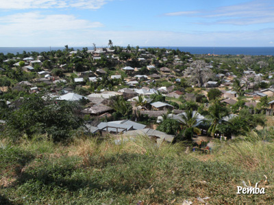 Donnerstag, 12. Mai 11, Tag 26, Pemba Auf Asphaltstraßen sehr unterschiedlicher Qualität geht es wieder ein Stück landeinwärts, auf der Nationalstraße weiter nach Norden und schließlich wieder ans Meer. Ziel ist die Stadt Pemba, die an einer ca. 20 Kilometer im Durchmesser haltenden Bucht gelegen ist, die nur durch eine schmale Öffnung mit dem Ozean verbunden ist. Die Stadt liegt sehr schön auf einem niedrigen Bergrücken, der auf einer Seite die Bucht begrenzt, doch ist sie ziemlich vermüllt. Wir campieren in der Pemba Magic Lodge (S12 57.958 E40 34.027), auch Russel's Place genannt, mit 240 Mt = 5,50 EUR p.P. ziemlich teuer. Der Platz ist sehr laut und, obwohl am sehr schönen Wimbe Beach gelegen, hat er keinen Strandzugang. Dafür, dass das Meer ohnehin grade nicht da ist, sondern gut einen Kilometer weit draußen, können sie hier, zugegebener Maßen nichts. Km 435/6.103/49.645.