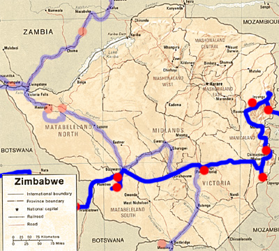 Sonntag, 1. Mai 11, Tag 15, Mutare Vom Nachtplatz geht es noch ein ordentliches Stück nur sehr mühsam weiter, dann wird die Piste, während sie ins Tal führt, langsam zunehmend besser, bis sie in Cashel in die Asphaltstraße einmündet. Von hier geht es zügig nach Mutare, wo wir tanken, einkaufen und ein Internetcafe aufsuchen. Auf der Weiterfahrt Richtung Harare überfahre ich leider einen Leguan, der in einem Höllentempo die Straße quert. In Rusape biegen wir von der Hauptstraße Richtung Juliasdale ab und übernachten kurz vor Dianas Vow an einem "Bichl". Wieder ist es ungemütlich kühl. Km 257/3.471/46.913. |