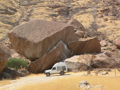 Samstag, 26. September 9, Tag 4, Spitzkoppe Zunächst geht es steil den Bosua-Pass hinunter, dann ist bald Karibib erreicht. Hier gibt es ein Internet-Cafe, doch es gibt keinen Netzkabeladapter, damit mein Notebook an die Steckdose kann. Ich stelle das ganze Auto auf den Kopf, finde dennoch meinen nicht. Ich hab aber Glück, in einem Laden gibt es einen, der dann noch ein wenig mit dem Stanleymesser bearbeitet werden muss, damit er passt. Das ist nicht die einzige Panne im Zusammenhang mit dem Computer. Schon gestern hab ich festgestellt - ich könnte mich ohrfeigen -, dass ich kein 12-V-Netzgerät für das Notebook mithabe. Ich hätte schwören können, ich hätte im Februar eines im Auto gelassen und hab daher diesmal keines mitgenommen. So ein Mist: Ich bin jetzt auf 220-V-Steckdosen angewiesen. Beim Mittagessen in einem Restaurant in Usakos hängt es schon an der Leitung. Nun geht es zur Großen Spitzkoppe, einem markanten Berg, der sich aus der Ebene erhebt und an das Matterhorn erinnert. Hier soll es tausende von Felsmalereien geben. Man bezahlt 35 NAD = 3,30 EUR per Person und 10 NAD = 1 EUR für's Auto. Dann kann man um und zwischen den Felsbergen herumfahren. Es gibt sehr beeindruckende Felsformationen. Hauptattraktion ist das Bushman's Paradise. Um dorthin zu gelangen, muss man etwa 150 Meter auf einem glatten Felsen hinaufsteigen, als Hilfe ist eine Kette angebracht. Oben erwartet einen eine grüne Oase umgeben von Felswänden, dort und da finden sich auch ein paar Felsmalereinen, aber in schlechtem Erhaltungszustand. Dennoch hat sich der Aufstieg sehr gelohnt, es ist einfach ein unbeschreiblich schöner Ort, von dem man noch dazu eine tolle Aussicht auf die darunter liegende Ebene und die Nachbarberge hat. Nach einer Rundfahrt durch die Felsberge fahre ich noch weiter bis Uis und dann noch ein Stück Richtung Brandberg. Als mir sechs oder sieben Männer entgegen kommen, die ihr Auto schieben, weil die Batterie leer ist, leiste ich Starthilfe und ernte dafür ein dankbares Gejohle. Kurz vor dem Brandberg übernachte ich einen Kilometer neben der Piste im trockenen Savannengras. Hier im Damaraland gibt es erfreulicherweise kaum Zäune. Km 364/754/24.830. |