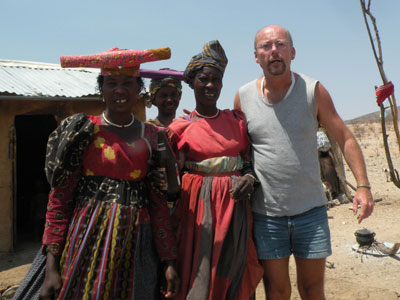 Montag, 28. September 9, Tag 6, Robbies-Pass Was für ein Tag! Es gibt nur ein Wort dafür: Unbeschreiblich. Doch von vorne: Es fängt alles bestens an. Der reparierte Reifen ist dicht. Dann laufen mir gleich auf der Hauptstraße nach Sesfontein ein paar Zebras, Giraffen, ein Oryx und jede Menge Antilopen über den Weg. An einem Stand an der Straße kaufe ich ein paar Herero-Puppen. In Sesfontein gibts keinen Diesel, macht nichts, muss ich halt irgendwann Opuwo ansteuern. An einer Straßenküche esse ich schon am Vormittag Fleisch aus dem Kessel. Brot gibt es keines, dafür "gebackene Mäuse". Schon bei meinem letzten Aufenthalt im Kaokoveld hat mich der auf der Baedeker-Karte eingetragene Robbies-Pass neugierig gemacht. Die Karte zeigt eine Straße##, die von Sesfontein über den Pass direkt nach Norden nach Kaoko Otavi führt und gibt 92 Kilometer an. Doch im Ort zweigt nirgendwo eine Straße ab. Nachdem ich mehrmals gefragt habe und niemand den Pass kannte, will ich schon umdisponieren und Richtung Purros fahren, doch da sehe ich wenige Kilometer außerhalb von Sesfontein einen Abzweig nach Norden. Ich fahre die Straße rein, sie führt zu einem Camp, doch eine dünne Spur führt weiter, zunächst einen Berg hinauf, dann drüben sehr steil runter, es ist sehr steinig, dann geht es durch ein trockenes steiniges Flussbett und dann wieder eben dahin. Plötzlich münde ich in eine relativ breite Schotterstraße ein. Erst einige Zeit später wird mir klar, dass dies wieder die Straße von Sesfontein nach Purros ist, die einen großen Bogen beschreibt. Die Abkürzung, die ich gemacht habe, hat sicher fünfmal so viel Zeit benötigt, als die Hauptstraße. Also ist nichts mit dem Pass und es geht doch nach Purros. Nach kurzer Fahrt kommt ein Wegweiser (S19 04.600 E13 32.511) mit der Aufschrift "Otjikondavirongo Primary School 41 km". Dieses Dorf ist auf der Karte etwa in der Mitte zwischen Sesfontein und Kaoko Otavi, kurz vor dem Robbies-Pass verzeichnet. Also doch Pass! Anfangs ist die Piste noch halbwegs zügig befahrbar, doch sie wird zunehmend schlechter. In einem Hererokral (S18 54.418 E13 32.185) halte ich. Es scheint nur in einer kleinen Hütte jemand zu sein, doch ich bin erstaunt, wie viele Frauen und Kinder da herauskommen. Die Damen wollen zuerst nicht fotografiert werden, doch als ich ihnen ein paar Kartoffeln schenke, darf ich. Die Erdäpfel werden interessiert beäugt, sowas haben die Frauen noch nicht gesehen. Ich versuche zu erklären, dass man die Dinger kochen muss vor dem Essen, aber keine versteht mich. Erst als ich eine Kartoffel in den Topf am Feuer schmeiße, kennen sie sich aus. Wir haben dann noch eine Menge Spaß, als eine der Frauen Fotos mit meiner Kamera machen darf. Otjikondavirongo (S18 45.669 E13 32.293) besteht eigentlich fast nur aus der Schule. Nur ein paar unbewohnte Hütten stehen im Respektabstand. Eine Menge Kinder spielen vor der Schule. Als ich nach dem Robbies-Pass frage, verstehen sie mich nicht und holen den Lehrer. Der kennt den Pass auch nicht und meint, der Weg nach Kaoko Otavi führt über Sesfentein. Als ich nachhake, meint er, es gäbe schon noch einen anderen auch noch, aber da fährt kaum jemand, weil so viele Steine sind. Er gibt die Fahrzeit mit 4 Stunden an. "Fährt kaum jemand" und "viele Steine" macht mich jetzt erst recht neugierig auf den Pass. Zuerst geht es allerdings ziemlich eben dahin, immer wieder sind trockene Bach- und Flussbetten zu durchqueren, teils geht es recht steil runter und rauf. Bei einer solchen Bachbettquerung sitze ich mit der hinteren Stoßstange auf und die Räder drehen trotz Allrad durch. So kommt die neue Seilwinde zu ihrem ersten Einsatz. Funktioniert bestens, gleich bin ich draußen. Es dauert halt eine Weile, bis das Seil wieder anständig auf der Rolle ist, Handschuhe und Bedienteil ordentlich verstaut und die Hände gewaschen sind. 200 Meter später das gleiche wieder. Diesmal klappt es aber erst auf den dritten Versuch, denn die ersten zwei Bäume sind im Nu entwurzelt. Nun wird der Weg immer steiniger, die Steine immer größer und dann dreht der Weg in ein enges Tal hinein, an dessen Ende der Pass sein muss. Nun geht es nur mehr mit Allrad im ersten Gang und Untersetzung, maximal im Schritttempo. Die Steine, über die es drüber geht, werden immer größer, mehrmals steige ich aus, um zu überlegen, wo es drüber gehen könnte. Zudem wird der Baum- und Buschbestand immer dichter, sodass mein Buschmesser mehrmals zum Einsatz kommt, aber dennoch mein Toyo viele Kratzer einstecken muss. Schon bin ich am Zweifeln, dass der Weg überhaupt befahrbar ist, dass das überhaupt ein Weg ist. Doch auf den kurzen sandigen Abschnitten sind vereinzelt Reifenspuren erkennbar. Da ist also schon mal jemand gefahren. Also weiter! Als ich ein längeres Stück im Flussbett über riesige Steine hopple, kommt mir ein Eselsgespann entgegen. Jetzt ist es mir klar, wo die Reifenspuren herkommen. Der kleine Wagen hüpft leicht überall drüber. Der Lenker des Eselkarren kann leider kein Englisch außer "smoke". Ich fahre weiter und es wird immer schwieriger, manschmal sitze ich schon mächtig auf den Steinen auf. Mehrmals denke ich ans Umkehren, doch jedesmal, wenn ein Platz kommt, an dem man umdrehen könnte, geht's wieder ein Stück leichter voran. Als ich dann an eine Stelle komme, wo ich glaub, ich komm unmöglich drüber, will ich zurückschieben, doch das geht keinesfalls, weil ich nicht sehe, wo ich hinfahre. Also nach vorne! Ich schwöre, wenn ich da drüber komm, dann dreh ich bei nächster Gelegenheit um und kapituliere vor dem Robbies-Pass. Und ich komme drüber. Dann kommt auch ein Platz (S18 39.298 E13 31.584), der grade groß genug zum Wenden ist und nun die ganze Tortur nochmals, ich bin von der Schule etwa 15 Kilometer entfernt und habe dafür fast drei Stunden benötigt. Ich schwitze wie ein Irrer, denn schon vor ein paar Stunden ist die Klimaanlage ausgefallen. Ich hab auch schon unter der Motorhaube nachgeseh