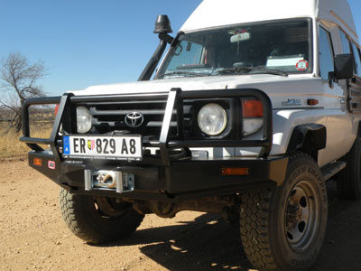 Halbwegs ausgeschlafen steige ich aus dem Flugzeug. Die Passformalitäten verlaufen unkompliziert, aber langsam. Dafür ist mein Gepäck gleich da und auch mein Abholer wartet schon auf mich. Mein Landcruiser steht schon ungeduldig vor der Farm. Leider ist trotz regelmäßigen Ladens eine der drei Autobatterien kaputt. Ich kann mir eine ausleihen; mit der springt der Wagen sofort an. Ich verstaue mein Gepäck und fahre nach Windhoek, wo ich gleich die Werkstätte aufsuche, die dem Toyo morgen eine Seilwinde einbauen wird. Die Winde und eine neue Stoßstange mit Bullbar sind bereits eingetroffen. In einer nahen Reifenwerkstätte kaufe ich zwei neue Reifen, sodass nunmehr alle vier Räder die gleiche Größe aufweisen, nur das Reserverad ist noch eines von denen, mit denen ich von zu Hause weggefahren bin und die eine Dimension größer waren. Während der Reifenmontage repariere ich eine Schlauchverbindung unserer Wasserversorgung, die kaputtgegangen ist. Nun macht auch noch das Zündschloss Ärger: Der Zündschlüssel geht von Mal zu Mal schwieriger rein. Sieht aus, als würde ich ein neues Schloss brauchen. Eine große Toyota-Werkstatt könnte in vier Werktagen eines da haben, das ist wenig hilfreich. Ich frag mich zu Lock&Key durch und hier gibt es Soforthilfe und die noch dazu gratis: Der freundliche Besitzer streut Graphit ins Schloss und nach ein paarmal Schlüssel rein, Schlüssel raus ist das Problem behoben! Eine gleich große Batterie mit gleicher Leistung wie die kaputte zu finden, ist schwierig. Erst als ich Abstriche bei der Leistung mache, krieg ich eine. Nun schließe ich noch eine Autohaftpflichtversicherung ab (Forbes Insurances im Carl-List-Haus), die auch in Botswana und Südafrika und einigen weiteren Staaten gilt. Leider ist die Mindestversicherungsdauer 1 Jahr (naja ich komm ja eh wieder mal dann und wann) und sie kostet 671 NAD = 64 EUR. Morgen kann ich die Polizze abholen. Nach einem Großeinkauf in einem Supermarkt fahre ich zurück zur Farm und will die geliehene mit der gekauften Batterie austauschen. Doch die neue ist um fast vier Zentimeter zu lang und passt nicht in die Halterung. Ich sehe mir den Zettel mit den von mir aufgeschriebenen Maßen an und stelle fest, es ist der Fehler des Händlers, er hat mir eine falsche Batterie gegeben. Da muss ich morgen umtauschen fahren und nochmals die 40 Kilometer zurück zur Farm um die geliehene Batterie zurückzugeben. So ein Mist, ich will ja endlich in den Norden rauffahren! Ich nächtige auf dem Campingplatz der Farm. Km 115/115/23.801. Freitag, 25. September 9, Tag 3, Khomas Hochland Pünktlich um 8 treffe ich im Offroad-Center in der Diehlstraße ein. Während die neue Stoßstange und die Seilwinde montiert werden, bringe ich die Batterie ins Geschäft zurück. Leider haben sie keine passende und ich krieg mein Geld zurück. Als ich die Batterie vom Taxi ins Geschäft trage, laufen ein paar Tropfen Batteriesäure aus und ätzen mir sofort ein großes Loch ins Hemd. Im nächsten Geschäft haben sie eine Batterie mit den gewünschten Maßen, doch die Pole sind falsch. Da ich die Kabel recht lang in Erinnerung habe, nehm ich sie und bringe sie zum Offroad-Center. Doch das Plus-Kabel ist um einen Zentimeter zur kurz, die Batterie lässt sich nicht anschließen, also die Batterie wieder zurück ins Geschäft gebracht. Nun klappere ich alle Autozubehörgeschäfte in Windhoek ab, doch eine Batterie, wie ich sie brauche, gibt es nicht. Ich nehm also die nächst kleinere mit entsprechender Polung, die hat anstatt 100 nur 65 Ah, aber es hilft nichts, ich brauch eine, weil ich die geliehene zu Mittag zurückbringen muss. Zwischendurch hole ich die Versicherungspolizze ab. Um kurz nach 12 sind alle Arbeiten am Auto erledigt. Stoßstange und Winde kosten etwa soviel wie in Österreich, die Montage (2 Arbeiter, je 4 Stunden) macht allerdings nur 600 NAD = 57 EUR aus. Nachdem ich nun endlich die geliehene Batterie zurückbringen kann, geht's nun endlich raus in den Busch. Ich fahre von Windhoek nach Westen durch das Khomas-Hochland, ein von Büschen und Savannengras bestandenes Hügelland. Entsprechend ist auch die Straße, später Piste, kurvig und bergauf, bergab führend. Wild gibt es keines zu sehen, das Land ist eingezäunt. Bald komme ich zum Stillstand, weil der Dieselfilter ziemlich plötzlich verstopft ist. "Zufällig" hab ich einen neuen dabei. Ich passiere die Missionsstation Baumgartsbrunn (S22 36.517 E16 47.004), das Liebig-Haus (S22 36.506 E16 43.170), ein ca. 100-jähriges, mitten in der Einöde stehendes dreistöckiges Haus, das schon seit langem nicht mehr bewohnt ist und langsam verfällt, und die von den Schutztruppen erbaute Francois-Feste (S22 40.022 S16 37.113), eine unspektakuläre Ruine, von der man allerdings einen schönen Ausblick auf die umgebende Hügellandschaft hat. Ich übernachte auf dem Bosua-Pass (S22 41.537 E16 02.559)neben der Piste. Km 275/390/24.076. |