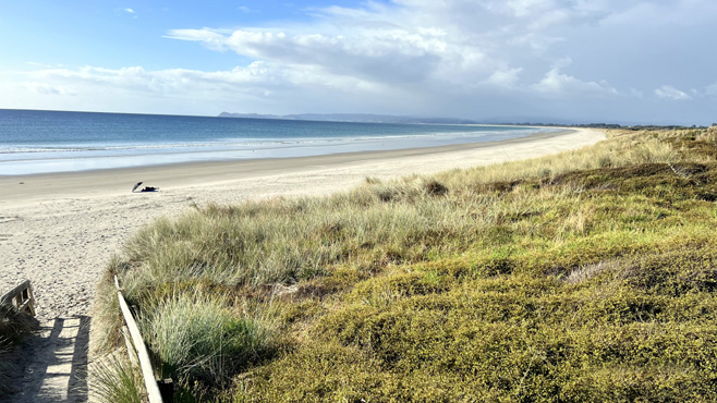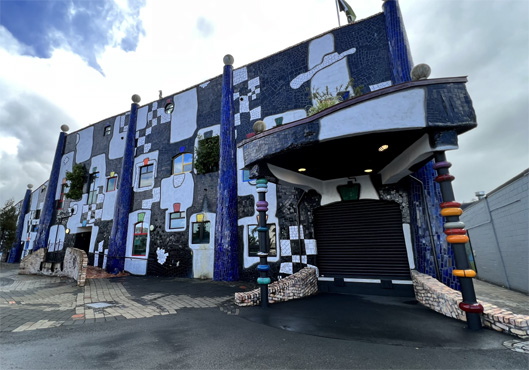 Wir spazieren durch den hübschen und untouristischen Ort Russel und queren dann mit der Autofähre das Waikare Inlet. Die Fähre benötigt für die 800 Meter weite Fahrt 10 Minuten und erspart uns eine Stunde Fahrzeit. Kaum irgendwo sind öffentliche Toiletten ein Touristenziel, aber jene von Kawakawa schon, weil sie Hundertwassers Werk sind. Er hat sie als Geschenk an seine Wahlheimat der Stadt spendiert und sogar von der Umfahrungsstraße ist der Weg ausgeschildert. In Kerikeri spazieren wir durch das Ensemble alter, gut restaurierter Häuser und machen uns dabei Gedanken über den weiteren Verlauf unserer Reise. Langsam wird es Zeit, nach Auckland umzukehren. Eigentlich wollten wir noch das weiter im Norden gelegene Gumdigger-Museum ansehen, das zeigt, wie früher aus dem Harz Jahrtausende alter, ausgegrabener Kauri-Baumstämme Gummi gewonnen wurde, aber leider ist der Highway 1 gesperrt und der Umweg wäre enorm, andererseits sind wir eh schon ein wenig reisemüde. Wir beginnen also mit dem Rückweg. Dazu geht es zunächst nach Westen, wo sich der Hokianga Harbour (kein Hafen, sondern ein Meeresarm) in die Tasmanische See öffnet. Die Mündung ist eng und von unserer Seite bietet sich ein spektakulärer Blick auf den Meeresarm und die gegenüber sich auftürmenden Sanddünen. Wir übernachten wieder sehr schön auf einem Platz am Ende eines Landzipfels hoch über dem Meer. Km 187/4.284.