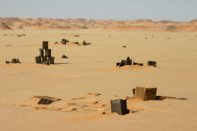 16, Flugplatz in der Wüste Nach einem Motorölwechsel bei Mahmouds Toyota - er wechselt alle 1.000 Kilometer! - geht es nun also langsam zurück Richtung Dakhla. Dazu bieten sich zwei Wege an, der eine führt um die Südspitze des Gilf Kebir herum, vorbei an einem der Treibstoffdepots unseres Führers Mahmoud. Da wir durch unsere nun stark verkürzte Route keinen Diesel aus dem Depot benötigen, fahren wir den anderen, kürzeren, durch das Wadi Wasa, praktisch durch das Gilf hindurch. Da auf der Zufahrt ins Wadi Wasa möglicherweise noch Minen liegen, fahren wir streng hintereinander in bereits vorhandenen Spuren, die sich hier zu einer Piste gebündelt haben. Mittagsrast halten wir an der Show-Cave, einer Höhle mit Malereien von Rindern. Nachdem wir das Gilf hinter uns gelassen haben, geht es nun Richtung Ost-Süd-Ost. In großen Mengen liegen Benzinkanister aus dem 2. Weltkrieg verstreut herum. Wir passieren Eight Bells, einen Flugplatz der Engländer, benannt nach acht glockenförmigen Hügeln in der Nähe. Auch nach mehr als 60 Jahren ist noch immer der aus sandgefüllten Benzinkanistern ausgelegte Schriftzug "8 BELLS" und ein großer Richtungspfeil sichtbar. In nur gut 30 Kilometer von der sudanesischen Grenze schlagen wir unser Nachtlager auf. Doch kurz zuvor gibt es noch Aufregung: Wie oft ist Mahmoud weit vorausgefahren und außer Sicht. Wir folgen seiner Spur, die er deutlich hinterlassen hat. An einer Stelle komme ich mit meinem Wagen dem Kamm einer Sicheldüne recht nahe, kann aber mein Fahrzeug noch rechtzeitig weglenken, bevor ich zu nahe an die weiche Stelle der Düne komme. Gerd gelingt das nicht, er entscheidet sich für die Abfahrt über die Steilfläche der Düne. Helmut, der als Nächster kommt, leitet eine Vollbremsung ein und bleibt im weichen Sand oben auf der Düne stecken. Er ruft per Funk um Hilfe und wir haben ihn im Nu herausgeschoben. Erst dann sehen wir an den Spuren von Gerds Wagen, welch abenteuerliches Manöver er hinter sich hat. Auch wenn die Düne sehr klein ist, hat nicht viel gefehlt, und das Auto wäre zum LIegen gekommen. Ingrid und Gerd zittern noch die Knie. Sie haben großes Glück gehabt. Erst auf der Weiterfahrt zum nahen Nachtplatz, wo bereits Mahmoud und Peter warten, merkt Gerd, dass sein Wagen komische Geräusche von sich gibt. Nach einiger Zeit findet Mahmoud die vermeintliche Ursache: Der Querlenker ist verbogen. Es gelingt, das Teil mit mehreren Wagenhebern auszubiegen, aber das Geräusch ist noch immer vorhanden. Der heftige Aufschlag nach der Dünchenabfahrt hat den Sitz einer Spiralfeder verschoben, die nun irgendwo scheuert. Die Reparatur dauert lange, aber nach gut zwei Stunden feiern wir bei einer Portion "Katastrophenfutter" deren Gelingen. Km 348/5.563. |
