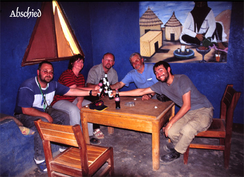 Die Piste ist sehr schlecht und nervtötend. Gegen Mittag treffen wir in Agadez ein und die Rumpelei hat ein Ende. Wir treffen uns mit Walters Bekannten1 zu einem gemütlichen Plausch. Dann machen wir die wichtigsten Erledigungen: Geldwechsel (1 EUR = 650 CFA), Abschluss einer Haftpflichtversicherung, die nicht nur für den Niger, sondern auch für Mali und erfreulicherweise auch für Mauretanien gültig ist. Der Preis ist von der Motorstärke abhängig und beträgt für unseren Toyo für drei Wochen 19.980 CFA (30 EUR). Außerdem versuchen wir, von der Polizei ein Feuille de Route bis an die malische Grenze zu bekommen, da das in Dirkou ausgestellte ja nur bis Agadez Gültigkeit besitzt. Wir geben unsere Pässe ab, um sie am Abend wieder abzuholen. Doch wir erhalten kein Feuille de Route mit der Begründung, das sei nicht mehr nötig. Sicherheitshalber fragen wir noch im Tourismusbüro, aber auch hier meint man, das sei nicht mehr nötig. Übermorgen werden wir sehen, dass das die Polizisten auf der Straße noch nicht wissen ... Wir übernachten (10.000 CFA = 15 EUR für alle) im Hof des Restaurant Tamgak, wo wir auch recht gut zu Abend essen. Km 104/5.462.