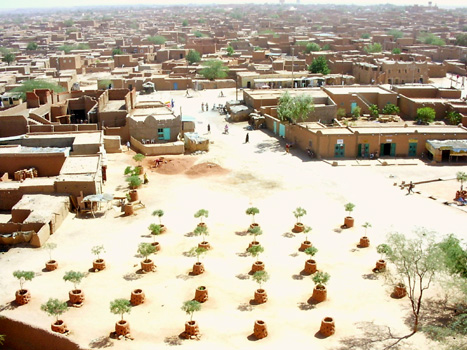 Heute wollen wir gleich als erstes unseren Reisebericht im Internet aktualisieren, doch leider Pech gehabt: Kein Strom. Wir bummeln daher zunächst durch die Stadt, werden dabei von unzähligen Händlern bedrängt, doch ihren echt antiken Schmuck, Messer, Schwerter und Lederarbeiten zu kaufen. Wir besteigen den Turm der Moschee, von dem man einen recht netten Ausblick über die Stadt hat. Man bezahlt 2.000 CFA (3 EUR) an den Moscheewächter, der direkt vor dem Aufgang des Turmes im Hof der Moschee sitzt. Achtung: Kein Geld an andere Personen zahlen! Bei einem Schuster lasse ich meine legendären Sahara-Schlapfen reparieren und schließlich führt mein Rundgang wieder zum Internet-Cafe, wo die Computer mittlerweile laufen. Am Nachmittag verabschieden wir uns von Walter und Josef, die in einigen Tagen ihr Auto in Agadez lassen und dann zurückfliegen werden. Wir anderen vier verlassen die Stadt Richtung Südwesten. Die Straßenmaut bis Tahoua beträgt für den Suzuki 750 CFA (1,15 EUR) und für unseren Landcruiser 1.250 CFA (1,92 EUR). Das Gelände ist eben und wenig bewachsen, so dass ein Nachtplatz nur schwer zu finden ist. Km 68/5.530.