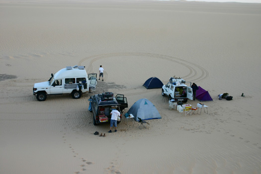 Wir bezahlen unserem Führer den Wucherpreis für seine unerwünschten Dienste. Die Geldscheine wandern sofort in die Hände anderer Männer. Der Bürgermeister ist heute bester Laune. Die Polizei kassiert noch 1.000 CFA (1,52 EUR) je Person für den Stempel in den Pass und, da kein Wechselgeld vorhanden ist, noch 1.000 für den Stempel auf dem Feuille de Route. Wir kaufen noch 200 Liter Diesel zu 375 CFA (0,58 EUR), die aus einem Fass in unsere Tanks und Kanister gepumpt werden. Nachdem wir den Diesel bezahlt haben, wird noch Geld für die Fotos, die wir beim Tanken gemacht haben, und fürs Umpumpen des Treibstoffs verlangt, eine Forderung, der wir nicht nachkommen. Auf dem Weg nach Bilma besuchen wir unsere Palme, die voriges Jahr versehentlich in Flammen aufgegangen ist. Sie lebt noch, sieht sogar recht gesund aus. In Bilma melden wir uns bei der Gendarmerie, wo man unsere Passdaten in ein Buch einträgt, eine Prozedur, die gut eine halbe Stunde dauert und - man höre und staune - nichts kostet. Anschließend essen wir im Restaurant des kleinen Ortes zu Mittag. Es gibt wahlweise Omelett, warme Sardinen aus der Dose und Reis. Während wir essen, sind unsere Autos von zahlreichen Kindern umlagert. Mehrmals müssen wir sie verscheuchen. Dennoch lassen sich bei unserer Rückkehr aus dem Restaurant an unserem und an Wolfgangs Auto die Türen nicht öffnen, da die Kinder Holzstücke in die Schlösser gesteckt haben. Wir sind sehr zornig; am liebsten hätte ich gleich Ohrfeigen verteilt, aber natürlich will es keiner gewesen sein. Nur mühsam lassen sich die Holzstücke entfernen und die Türen wieder öffnen. Auf der Weiterfahrt machen wir einen Abstecher in eine Saline. Unser Führer protestiert. Da müsse man vorher beim Bürgermeister Eintritt bezahlen. Obwohl außer uns kein Mensch in der Saline ist, fürchtet er, dass er eingesperrt wird, wenn wir nicht bezahlen. Irgendwie sind wir heute schon ein wenig genervt. Dennoch, oder vielleicht gerade deshalb, fahre ich mit dem Führer zurück nach Bilma und übergebe dem Bürgermeister 10.000 CFA (15,38 EUR). Nun geht es geradewegs nach Westen, hinein in die Ténéré, hinein in ein riesiges Sandmeer. Der Sand ist gut befahrbar und wir gleiten zwischen Ost-West verlaufenden Dünenzügen. Durch ein Missverständnis - ich stehe auf einem Dünenkamm und signalisiere mit Handzeichen ein tolles Fotomotiv auf der anderen Dünenseite, Walter interpretiert mein Zeichen als Aufforderung, die Düne hier zu queren - landet der schwarze Toyo mit Walter, Josef und dem Führer unsanft in einem Dünental, aus dem wieder herauszukommen nur mühsam gelingt. Unser Führer nimmt nicht am gesellschaftlichen Programm teil, isst weder mit uns, noch setzt er sich in unsere Runde. Früh begibt er sich zu Bett, eigentlich zu Teppich, in den er sich einrollt. So früh, dass er ab 4 Uhr nicht mehr schlafen kann und stündlich Gebete in die Stille schmettert. Vielleicht ist er, wenn er nicht gerade Führer ist, Muezzin. Km 134/4.907.