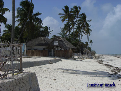 Montag, 19. Jänner 9, Tag 2, Sansibar In Mombasa gibt es eine Zwischenlandung; wir sitzen zwei Stunden auf dem Flughafen herum. Die afrikanische Schwüle ist bereits voll spürbar. Nach gut einer halben Stunde weiterer Flugzeit landen wir auf Sansibar. Unser Gepäck wird von Trägern auf ein Pult gestellt, es gibt kein Förderband. Das Visum ist problemlos um 50 USD (38,50 EUR) erhältlich, ich muss die letzte freie Seite in meinem Reisepass opfern. Vor dem Flughafen wartet bereits unser Mietwagen (Zanzibar Car Hire, 40 USD = 30 EUR pro Tag). Die Fahrt an die Ostküste der Insel ist zunächst sehr anstrengend, denn wir stürzen uns mit einem rechtsgesteuerten Suzuki Escudo mit ungewohntem Automatikgetriebe in den Linksverkehr des afrikanischen Straßengeühls. Auf der gut 40 km langen Fahrt gibt es vier Verkehrskontrollen. Man interessiert sich ausschließlich für den internationalen Führerschein; dass dieser bereits seit langem abgelaufen ist, spielt keine Rolle. Auf Anhieb finden wir unser Hotel in Jambiani. Unser Bungalow liegt direkt am weißen Sandstrand und ist einfach aber sauber (Shehe Bungalows, bei hostelbookers gebucht um 14 EUR/p.P/p.N. incl. Frühstück). Wir genehmigen uns gleich ein Mittagessen und legen uns dann aufs Ohr, um ein weng Schlaf nachzuholen. Das Abendessen nehmen wir bei Kerzenschein ein, denn der Strom ist ausgefallen. Erfreut nehmen wir zur Kenntnis, dass es keine Mücken gibt. Km 60/60/16.630. |