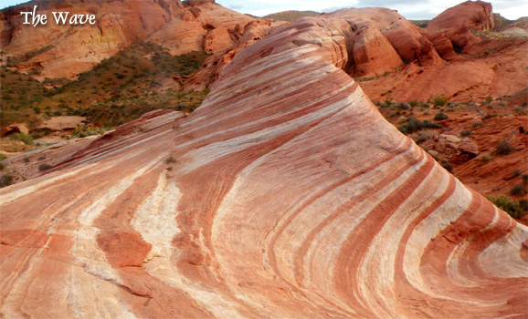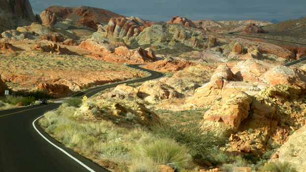 Auf der Interstate 15 verlassen wir die Stadt nach Norden und fahren im Nu durch die Wüste Nevadas. Unser Ziel ist das Valley of Fire, in dem verschiedenfarbige Gesteinsformationen ein spektakuläres Bild bieten. Am Atlatl Rock gibt es Felsgravuren zu sehen, die aber bei weitem nicht so beeindruckend sind, wie die in Nordafrika gesehenen. Besonderes Highlight ist "The Fire Wave", eine gestreifte Sandsteinwelle, die ich nach einem 20-minütigen Geländemarsch erreiche. Auf der Weiterfahrt leuchten die Felsen rot in der Abendsonne, was dem Tal seinen Namen gibt. Kurz vor Overton übernachten wir in den Poverty Hills. Auf dem weitläufigen Areal stehen verstreut gut 20 RV's. Mi 95/130.