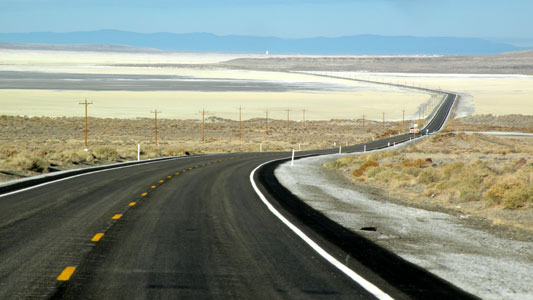 Wir fahren nun auf dem US-Highway 50 "The Loneliest Road in America" Richtung Westen quer durch die Wüste Nevadas. Die Straße wird durchaus ihrem Namen gerecht: Etwa alle zehn bis fünfzehn Meilen kommt uns ein Auto entgegen, alle 70 bis 100 Meilen passieren wir ein Kaff. Nur die Wüste enttäuscht uns völlig. Wie auch schon gestern fahren wir durch riesige Ebenen, die im Süd-Nord-Verlauf endlos scheinen, in Ost-West-Richtung ca. alle 20 bis 30 Meilen von einem quer verlaufenden Gebirge unterbrochen werden. Außer der Straße und einem Zaun zu beiden Seiten gibt es eigentlich nichts, keine Häuser, keine Bäume. Und alles völlig flach. Und dennoch keine Wüste. Denn alles ist bedeckt von einem dichten waden- bis kniehohen Gras- und Buschbewuchs. Am Nachmittag machen wir eine längere Pause und sitzen auf unseren Klappstühlen bei einem Kaffee genüsslich in der Sonne. Mi 257/1.596.