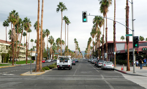 Trotz Straßenlärm schlafen wir bis 8 Uhr. Das Wetter ist noch schlechter als gestern: Es schüttet aus Wolken, die der Stadt praktisch aufliegen, die Hochhäuser sind Wolkenkratzer im wahrsten Sinne des Wortes. Wir sehen daher nicht den berühmten HOLLYWOOD-Schriftzug auf den Hügeln der Stadt. Wir fahren eine Runde durch das Zentrum und verlassen dann L.A. nach Osten, weg von der Küste und hoffentlich weg vom Schlechtwetter. Und wirklich: Auf halbem Weg nach Palm Springs scheint erstmals kurz die Sonne, in Palm Springs ist das Wetter schön, wenngleich dunkle Wolken in der Ferne in Sicht sind. Palm Springs ist eine in der Wüste künstlich reichlich begrünte Stadt, in der jeder, der in Los Angeles eine Luxusvilla hat, eine Zweit-Luxusvilla hat. Die kurze Hose wird ausgepackt und erstmals die Klimaanlage im Auto in Betrieb genommen. Im Zentrum der Stadt lüftet eine riesige Merylin-Monroe-Statue das Geheimnis, was denn die berühmte Blondine unter dem Kleid trägt. Nördlich der Stadt liegt die Thausand-Palms-Oasis, durch die wir einen Spaziergang machen, bevor wir noch ein Stück Richtung Joshua-Tree-Nationalpark fahren. Mi 169/2.698.